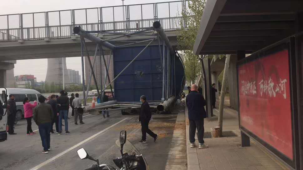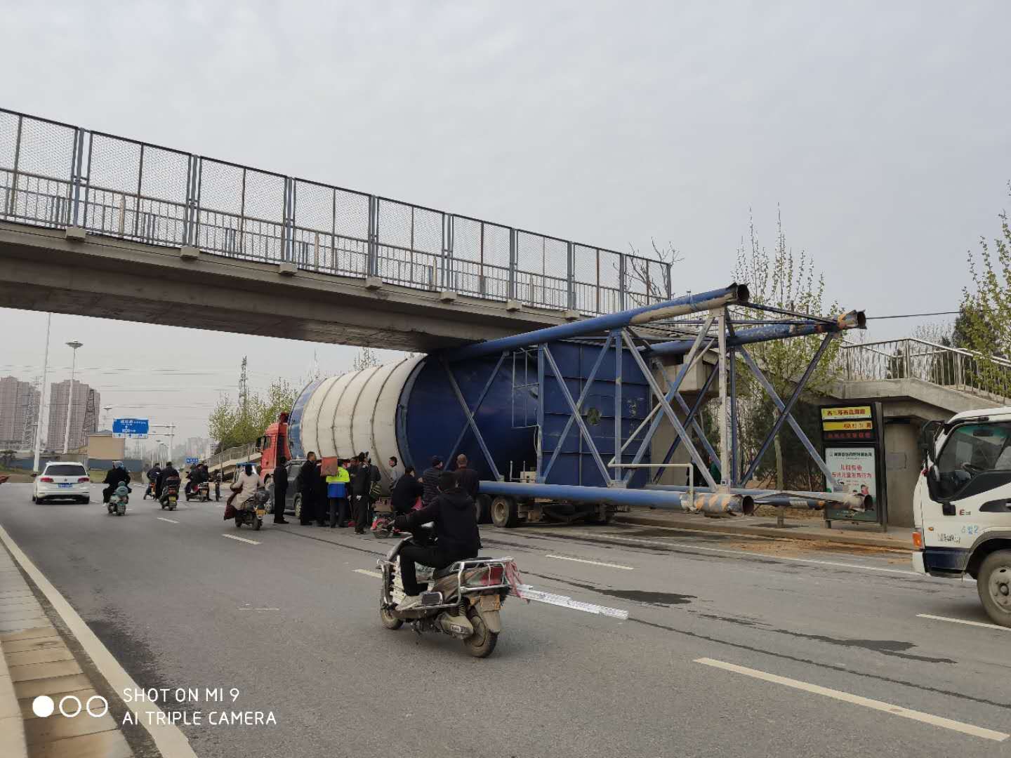 4月5日早晨,一辆外地牌照大货车行经郑州市西三环化工路交叉口南北西三环上一过街天桥,司机感觉车身较高,难以从高约4.5米的天桥下通过,遂停车用尺子量了量,卸掉两个大轮子,又找货车推土机合力帮忙,未曾想到,最终车子还是被卡在过街天桥下。