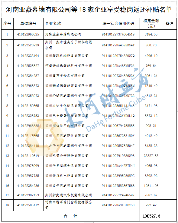 【大河财立方消息】11月12日消息,郑州市人力资源和社会保障局公示,为帮助企业稳定职工队伍,现拟向河南业豪幕墙有限公司等18家企业发放失业保险稳岗返还补贴。
