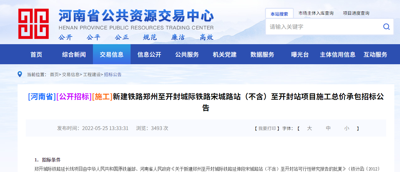 据河南省公共资源交易中心网站,郑开城际铁路延长线项目有最新进展,宋城路站至开封站将开工建设。