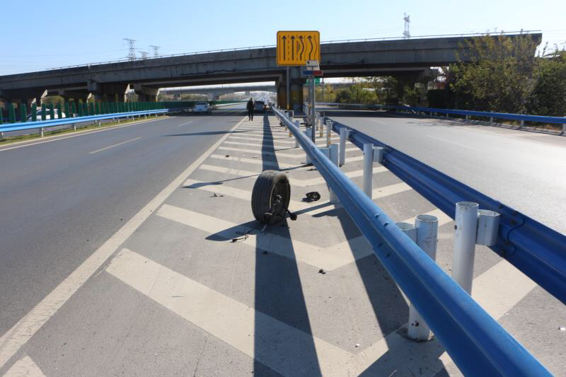 事发现场一片狼藉,出事轿车的右前车轮被撞掉,散落在车辆后方30多米的位置,正副驾驶前侧的气囊全部弹开,所幸的是有高速公路专用防撞垫的保护,司机李先生并无大碍。