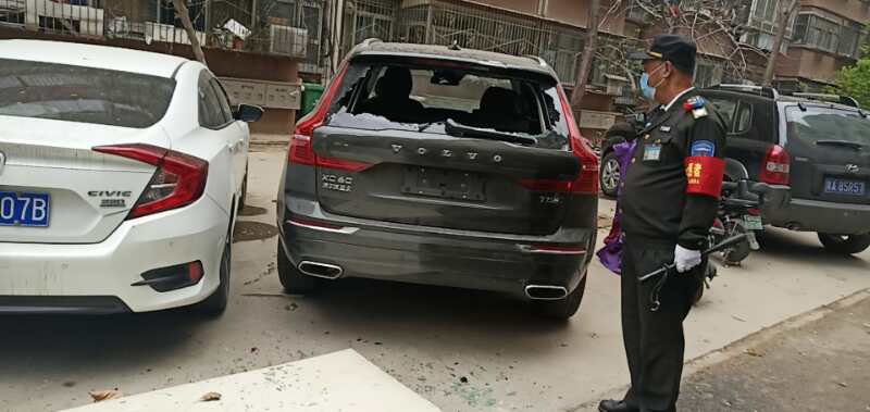 当天下午2点左右,中原区汝河路办事处巡防员黄良才和队友巡逻到淮河路工人文化宫路口附近六冶家属院11号楼附近。突然听到一声巨响,循声望去,只见4单元门口一扇门板砸到楼下一辆沃尔沃xc60私家车,致使该私家车后窗玻璃和车顶损毁,门板掉落在车后边。“谁的车,被砸了!”巡防队员寻找车主的时候,车主王先生从家中跑了出来,直称:“坏了,坏了!我听到外面有动静,就感觉不对劲儿,想不到真是我的车!”看到爱车被砸,车主王先生急忙联系小区物业,并报了警。