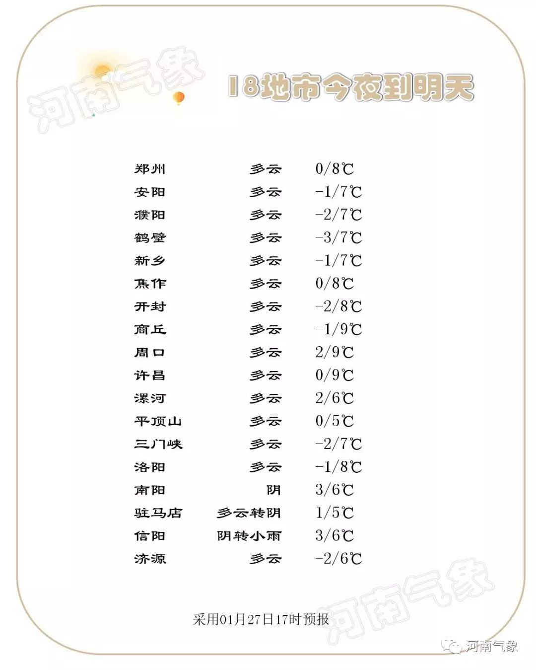 今天夜里到明天白天,南部阴天,其中南阳、信阳两 地区有零星小雨;其它地区多云间阴天。