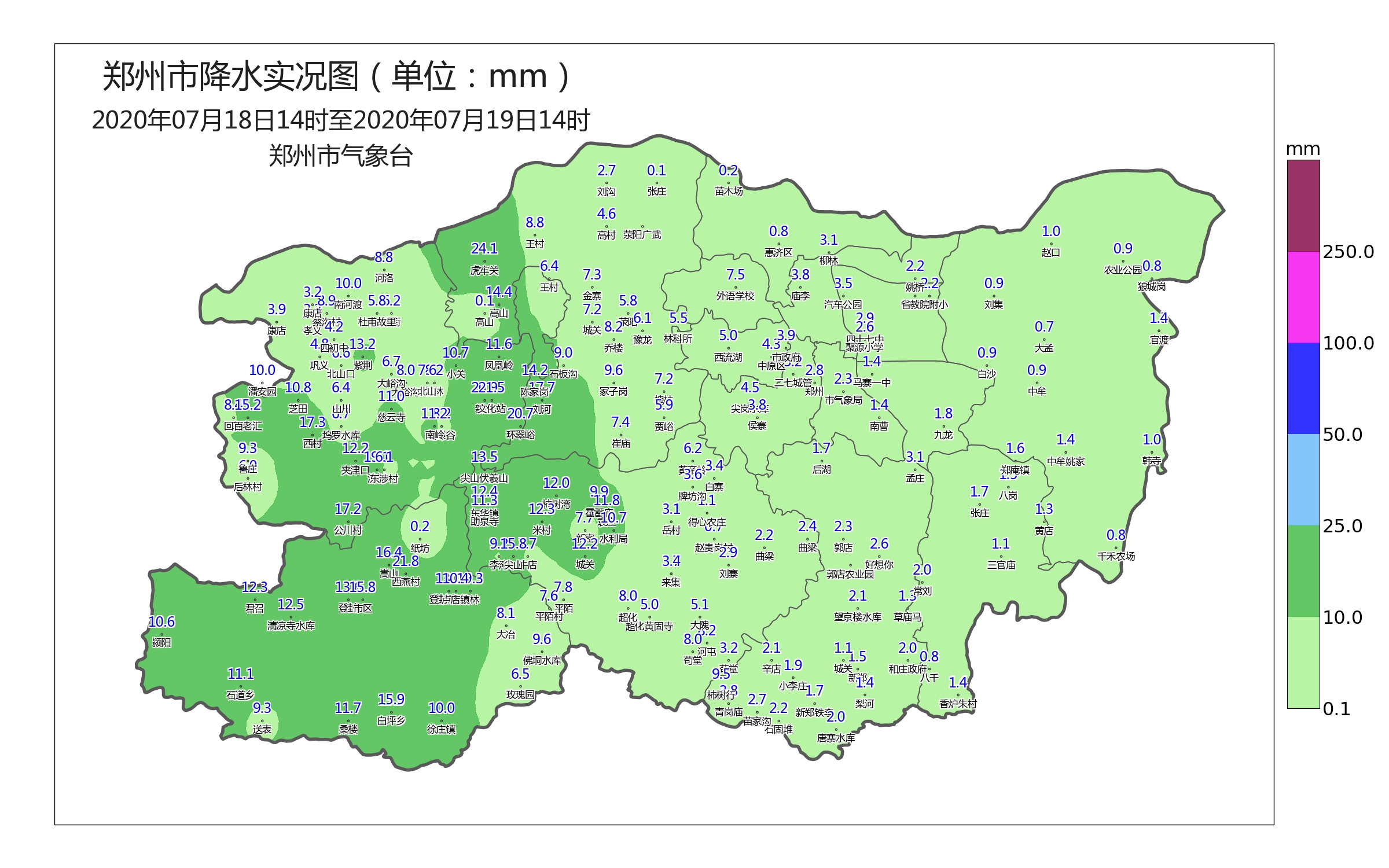 根据郑州市气象台统计,7月18日14时至7月19日14时,郑州市出现小到中雨。降水量在10-24.9毫米的站点有43个。雨量较大的站点有(毫米):郑州的外语学校7.5、林科所5.5;中牟县的九龙1.8、张庄1.7;新郑市的柿树行9.5、青岗庙3.8;新密市的尖山15.8、尖山伏羲山13.5;荥阳市的虎牢关24.1、环翠峪20.7、刘河17.7;登封市的西燕村21.8、少林19.3、嵩山站16.4;巩义市的文化站21.5、新中20.9、涉村19.1。