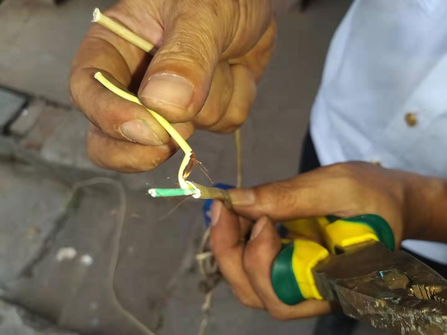 在现场,巡防队员范根喜、王李根首先用钳子剪断其中的一根线,然后用绝缘胶布将其缠上,再剪断另外一根电线,再用胶布缠住。