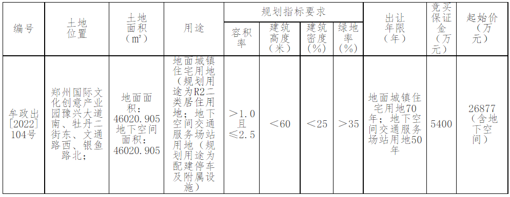 该地块为牟政出[2022]104号地,位于郑州国际文化创意产业园豫兴大道南、牡丹二街东、文通路西、银鱼路北,地面面积46020.905平方米(约69亩),为地面城镇住宅用地,起始价26877万元。