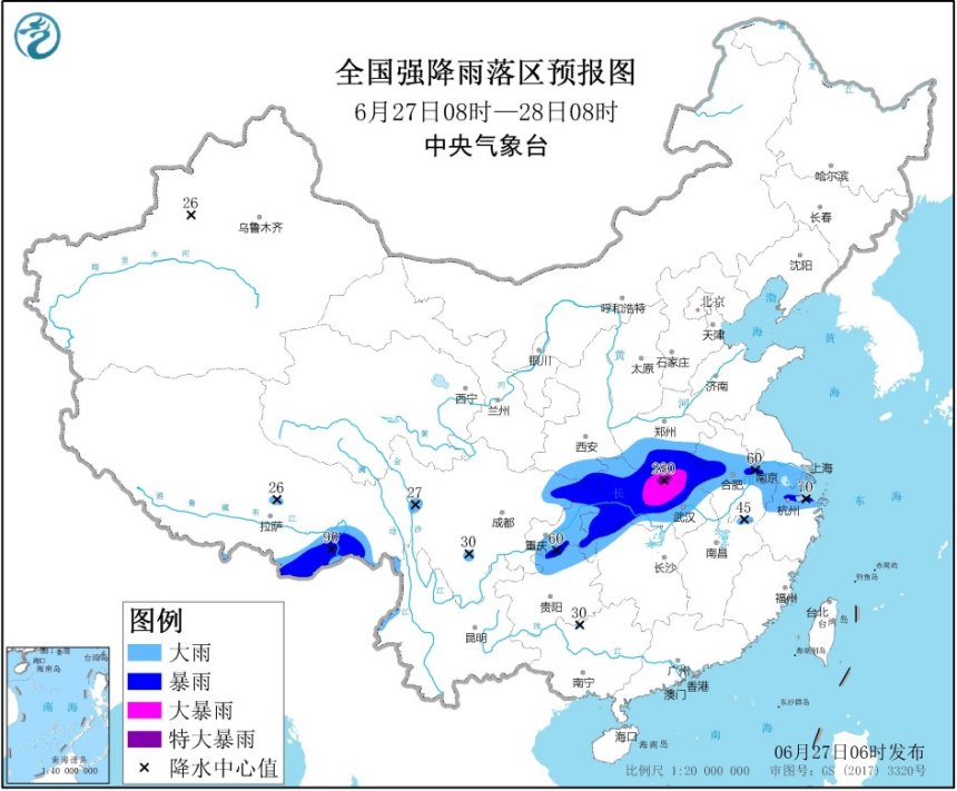 即将到来的这轮强降水,将主要影响我省的南部、东南部地区。根据中央气象台预报,6月27日8时至28日8时,四川盆地东部、贵州北部、湖南北部、陕西南部、江汉、河南中南部、安徽中部、江南东北部等地的部分地区有大到暴雨。
