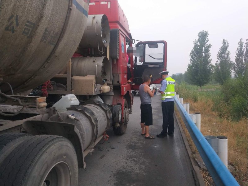 9日下午4时许,五支队三大队大队长朱永强等驾乘警车沿连霍高速公路北半幅自东向西巡逻至500公里处时,发现一辆津A牌照的大型罐车骑压左起第四行车道和应急车道分道线停放,闪着双闪灯,车后没有设置警示标志。