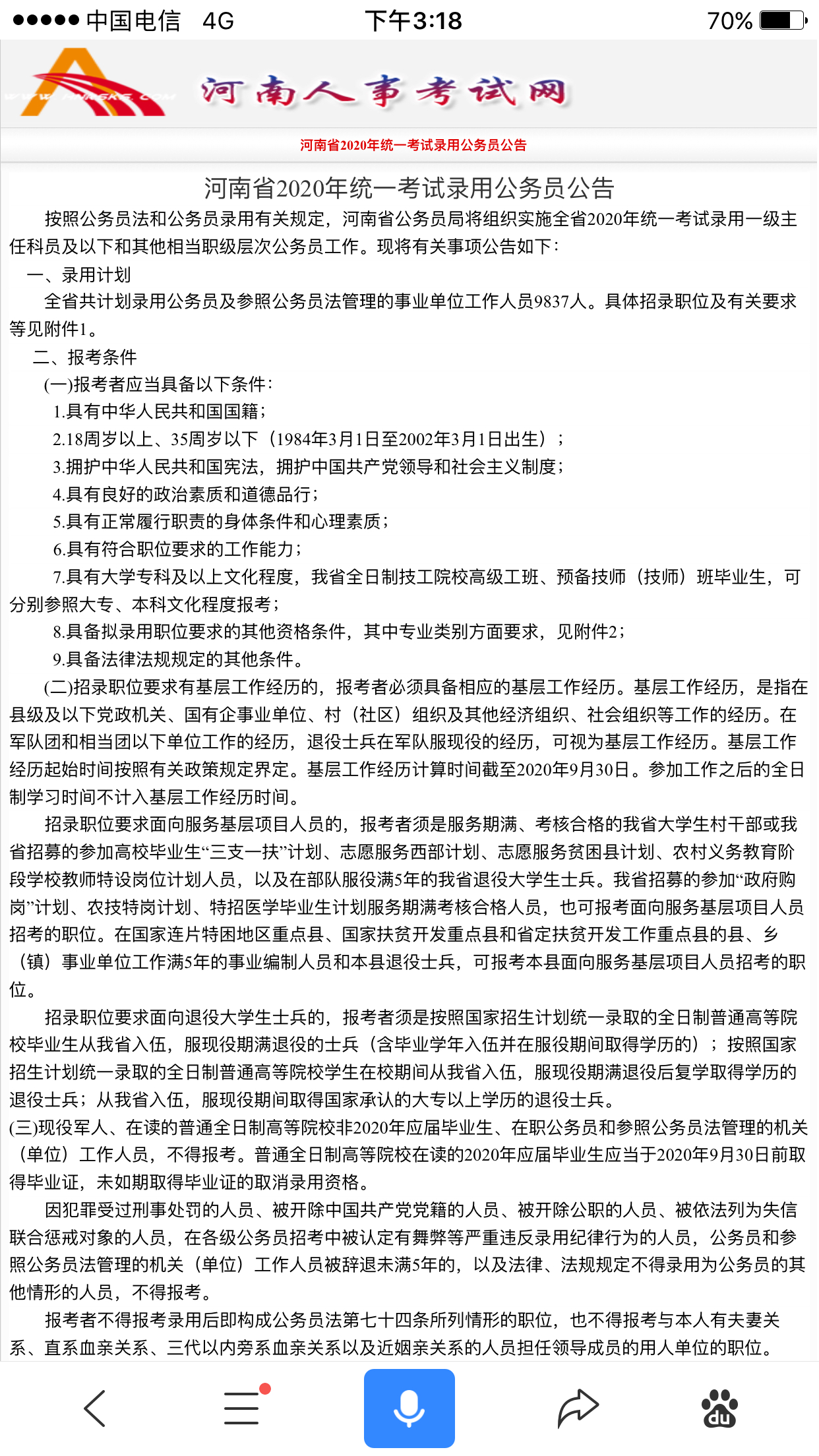 6月10日,在众多考生的期待中,河南省2020年统一考试录用公务员公告终于来了,2020河南省考统一招录9837人。按照公务员法和公务员录用有关规定,河南省公务员局将组织实施全省2020年统一考试录用一级主任科员及以下和其他相当职级层次公务员工作。具体公告如下: