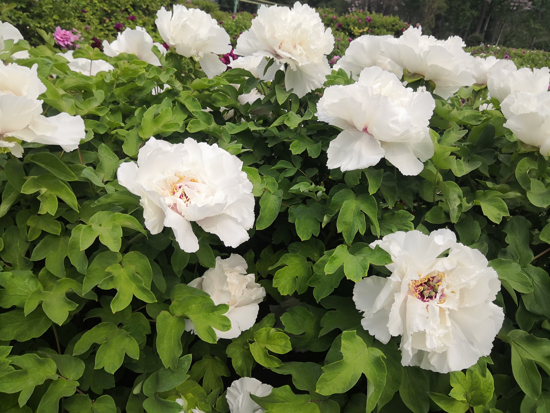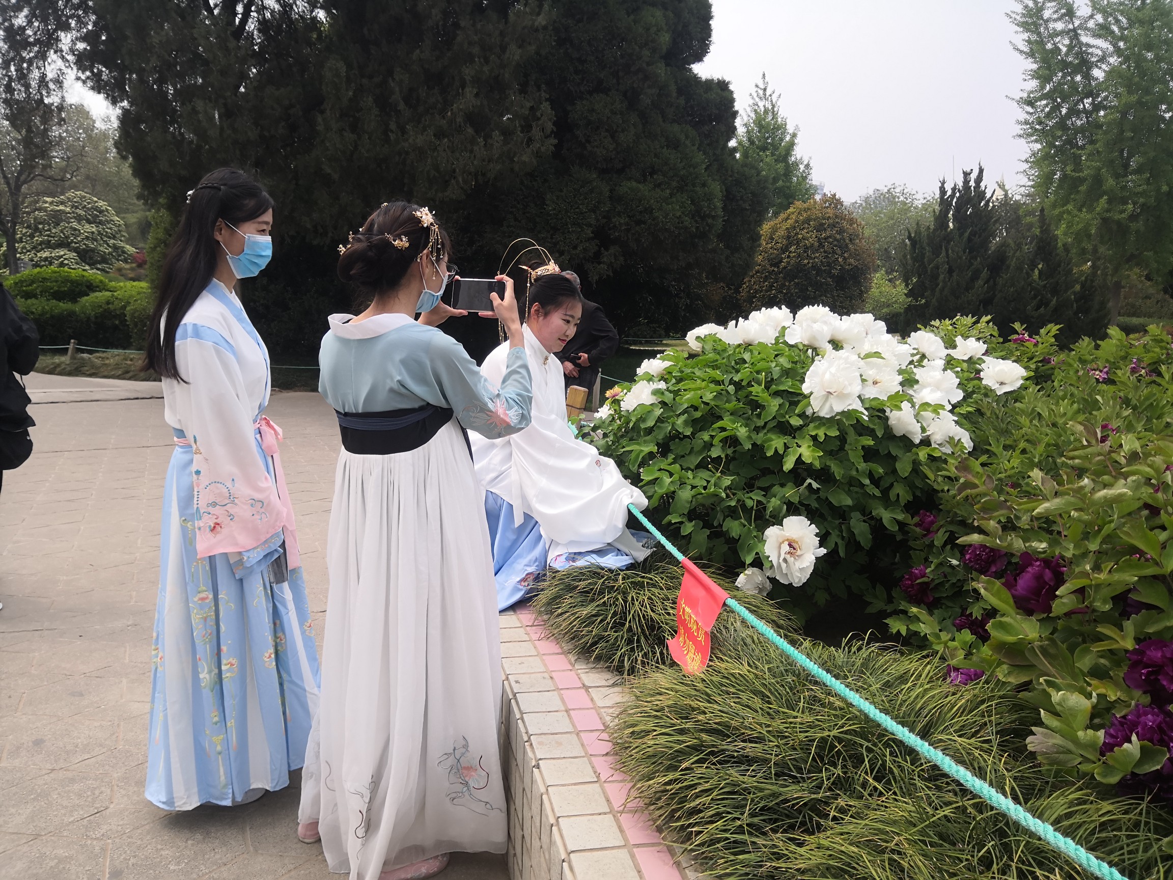 白的、粉的、玫红的、粉白相间的、米黄的……各色牡丹花开正艳,吸引了不少市民。有的自个拿手机拍照留影,有的用手机录像,有的现场给亲朋好友直播,还有年轻姑娘们身穿汉服、头戴古代发簪现场搞穿越。