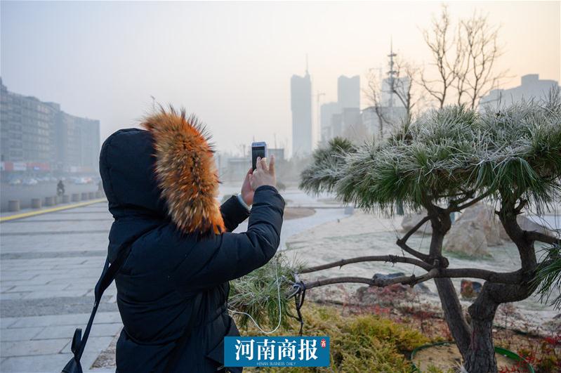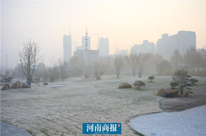 2019年12月22日,中国农历中一个重要节气“冬至”,早晨郑州市街边小道的路边结上了一层雪白的霜花,一道道白雾将公园打造的朦朦胧胧,装扮的如梦如幻。(河南商报记者 宋亚猛 文图)