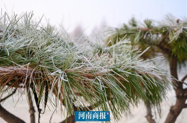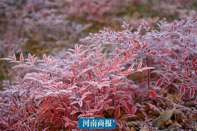 郑州冬日美景:霜花挂上枝头、点缀红叶,铺满草地……简直美哭了