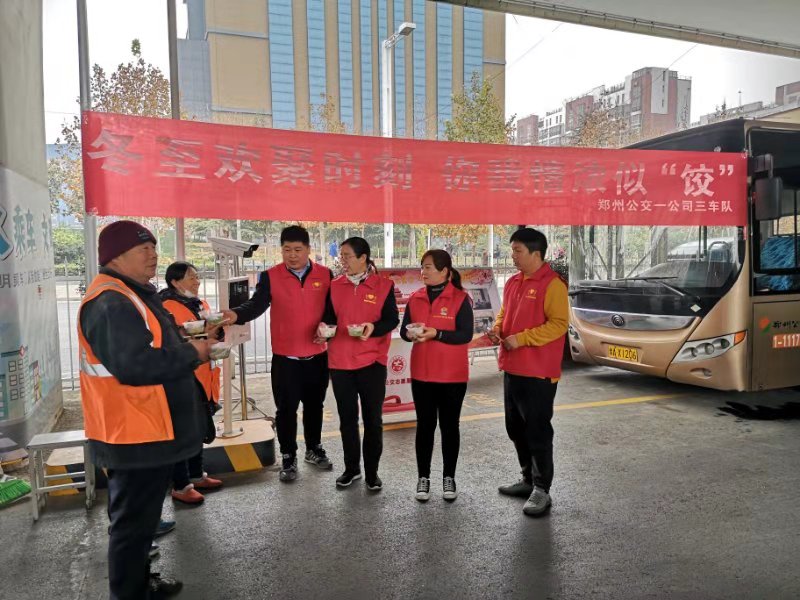 2019年12月20日,在即将到来的冬至节气,郑州公交一公司曹瑞娟志愿服务队的志愿者们来到中原西路西三环37路公交场站,亲手为环卫工以及乘客们送上亲手包的暖心饺子。