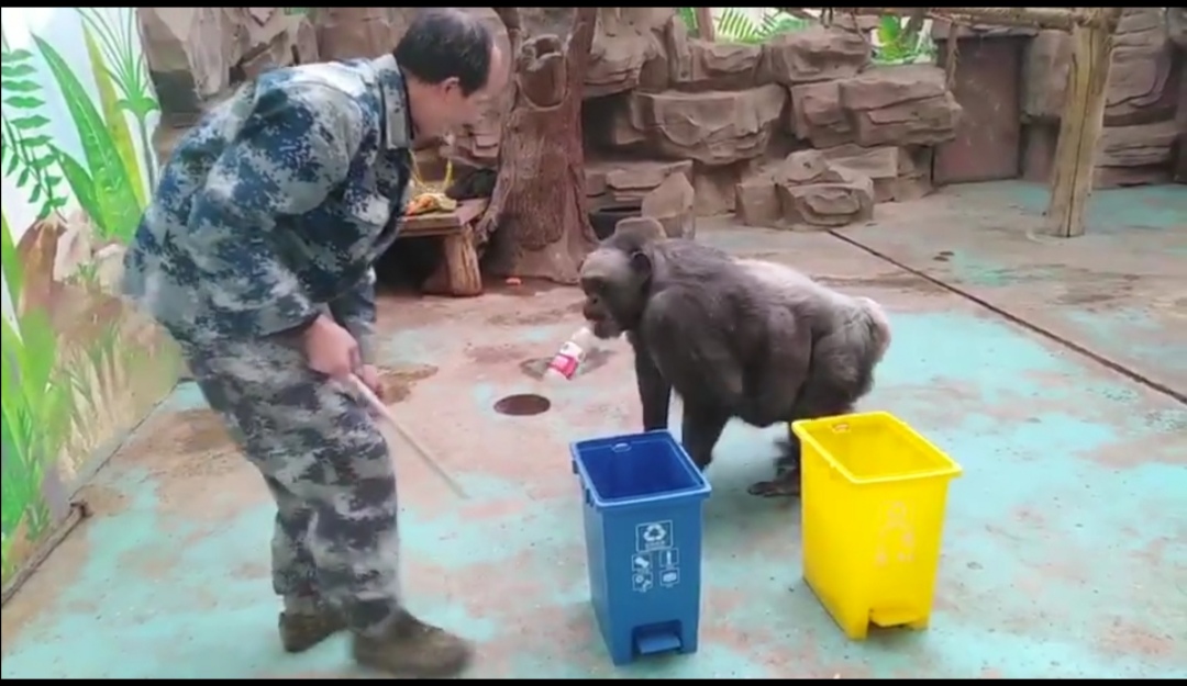郑州动物园的黑猩猩也开始学垃圾分类了?