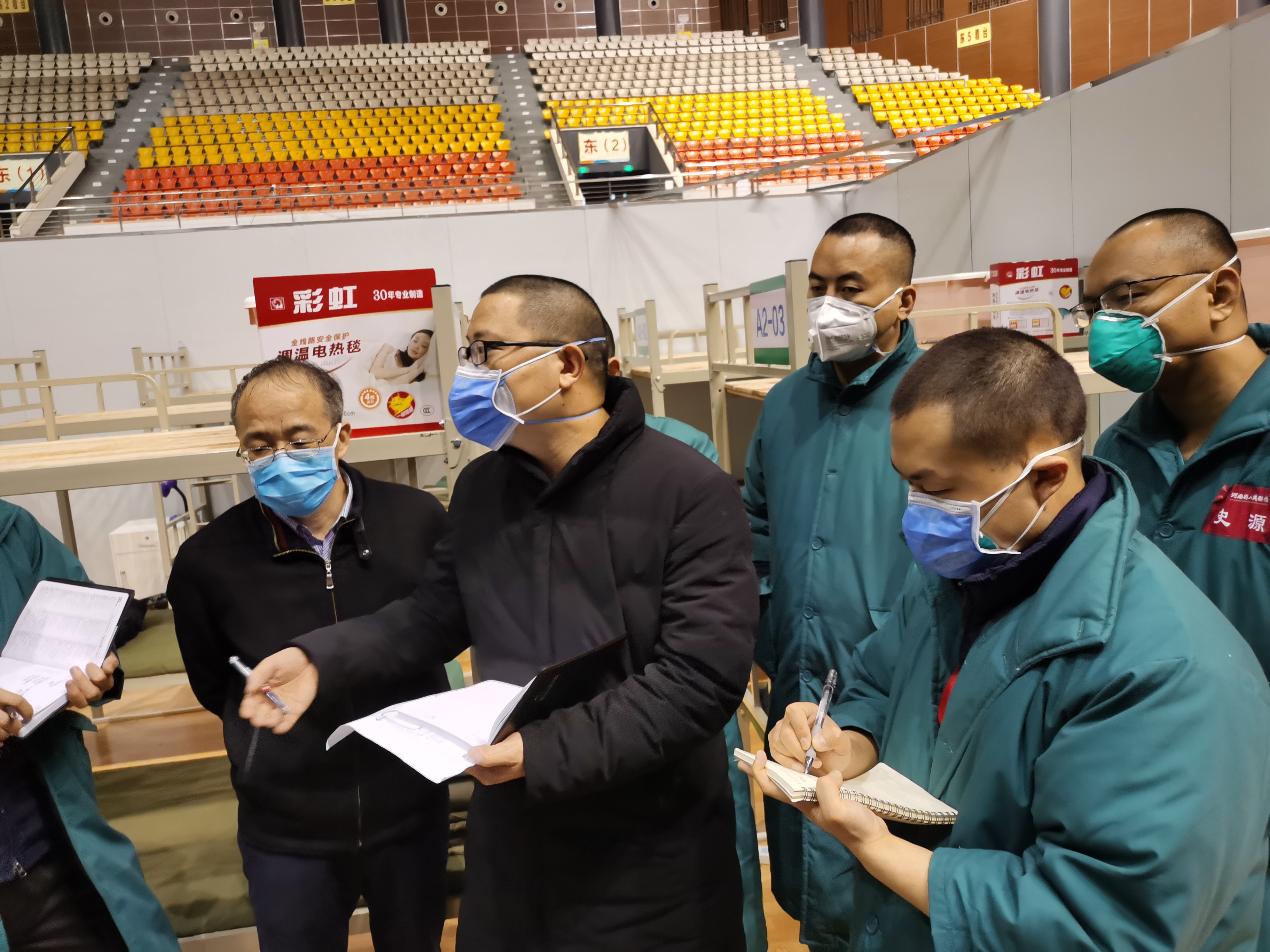 2月12日上午,武汉青山区方舱医院,河南第五批援鄂医疗队队长、河南省人民医院副院长陈传亮,率领29名队员正在仔细勘察“战场”。