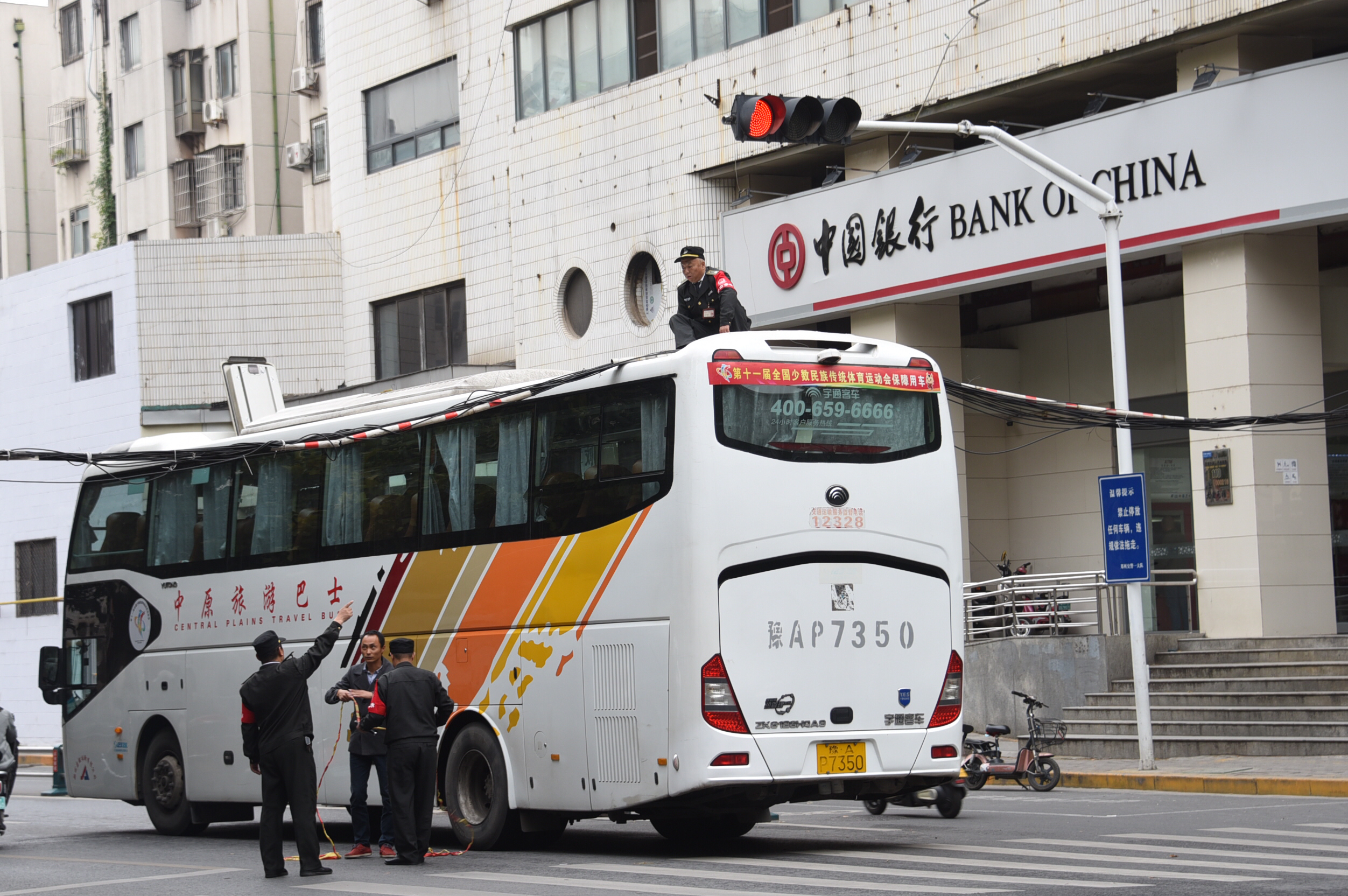 在学校门口站爱心岗的金水区经八路办事处巡防队员,看到眼前突然发生的险情,立即上前疏散学生,指挥来往车辆绕行。记者赶到现场时,看到挂住线缆的豫A牌照的大巴车停在路口,被挂落的一捆电缆压车尾顶部,被掀开的通气窗挂住。交警赶到后,对大巴车司机进行询问。