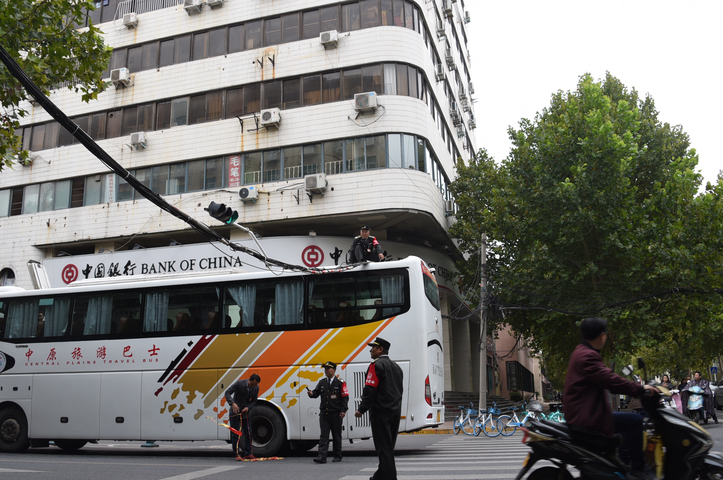 大巴车司机崔先生看着眼前的一切,十分沮丧。他说,今天早上,路口东边的一所学校包他的车,要带学生外出参加活动,没想到经过路口时,顶部敞开的天窗竟然挂住了空中的线缆,惹出了乱子。事发后,他及时报了警。