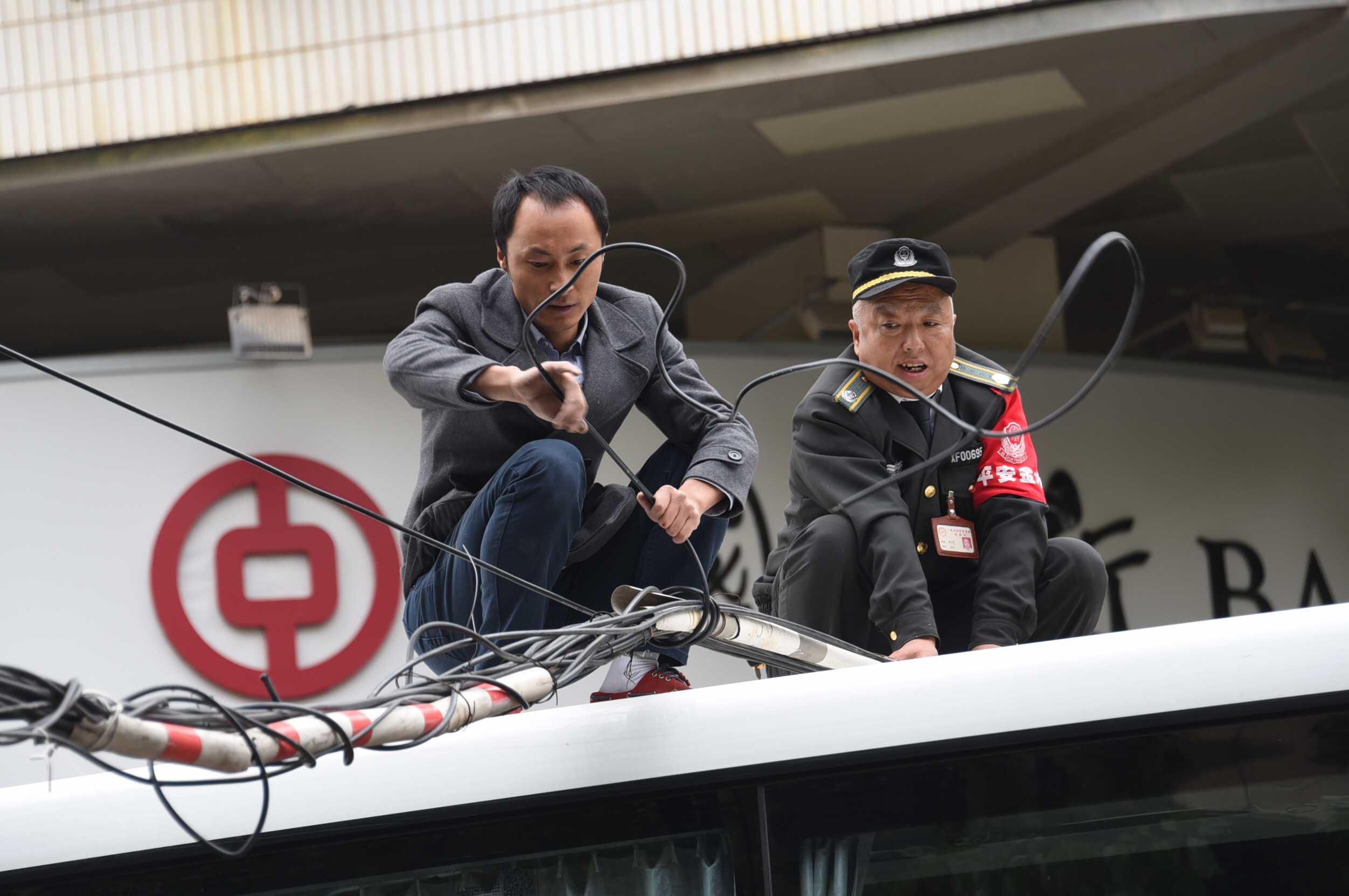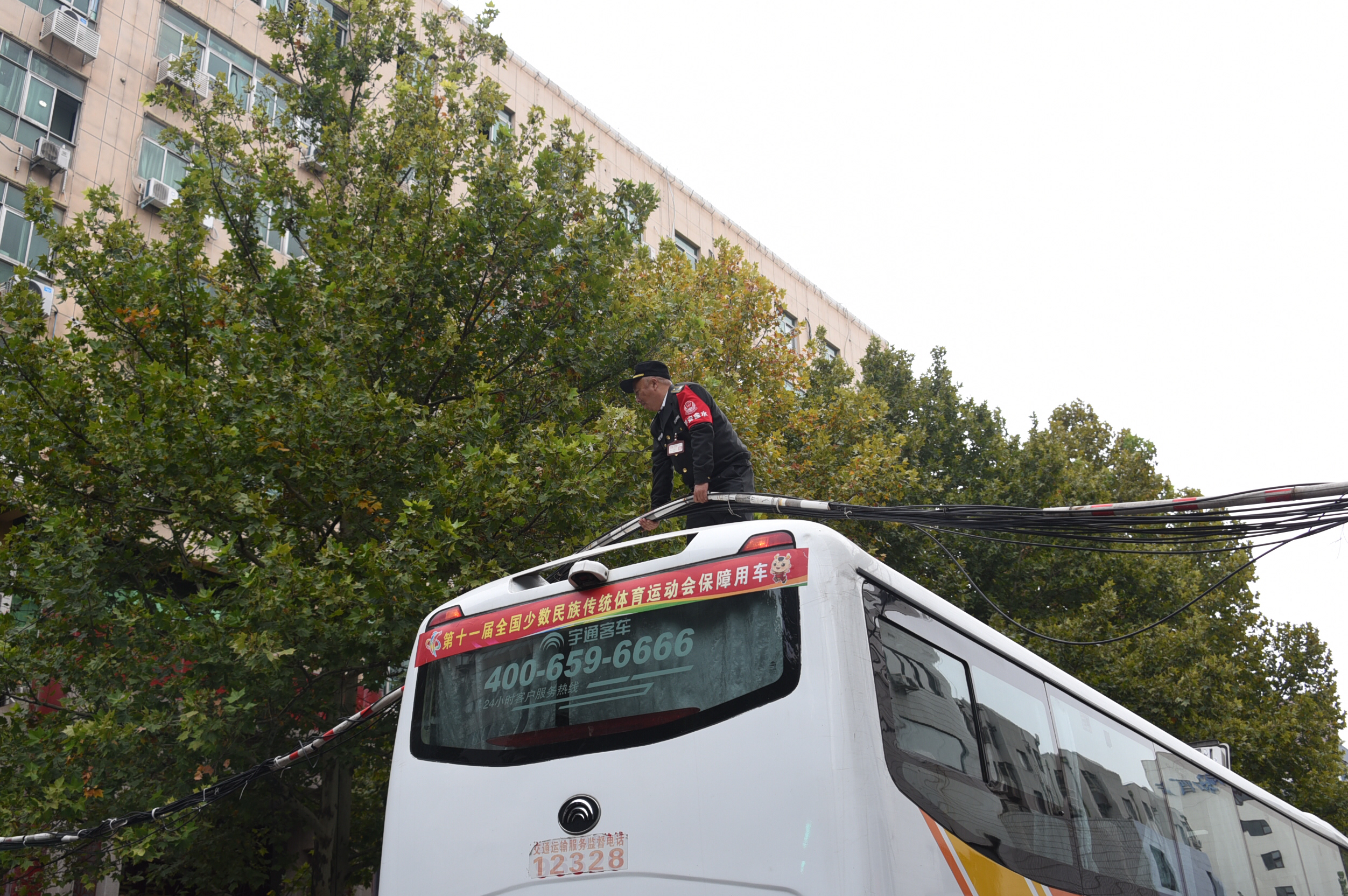为了使路口尽快恢复畅通,巡防队员贺占成拨打了郑州城建服务热线。工作人员表示将立即通知相关单位到现场确权处置。因肇事大巴车司机要急着赶到前方学校接送急着外出参加活动的学生,民警对其进行询问登记后,司机在巡防队员的帮助下,上车顶将线缆托起,然后爬到树上将垂落的线缆收紧固定,这才使大巴车得以脱身。