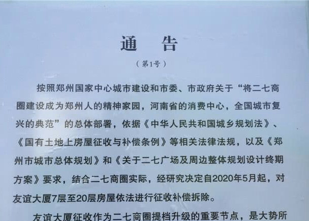 采访中记者了解到,5月16日,二七区德化街街道办已贴出“第1号”通告。通告中称:按照郑州国家中心城市建设和市委、市政府关于“将二七商圈建设成为郑州人的精神家园,河南省的消费中心,全国城市复兴的典范”的总体部署,依据《中华人民共和国城乡规划法》、《国有土地上房屋征收与补偿条例》等相关法律法规,以及《郑州市城市总体规划》和《关于二七广场及周边整体规划设计终期方案》要求,结合二七商圈实际,经研究决定自2020年5月起,对友谊大厦7层至20层房屋依法进行征收补偿拆除。