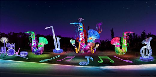 第四板块 以传播园博文化为主题,设置有“七彩凤凰”、“奏响新春”等大型灯组;