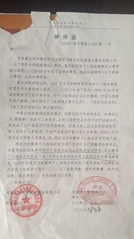 河南永恒凯旋物业服务有限公司远大理想城西区管理处发来的一张律师函,上面称,希望她们在收到律师函后7日内及时与永恒物业联系,及时搬离个人物品并返还地下室。