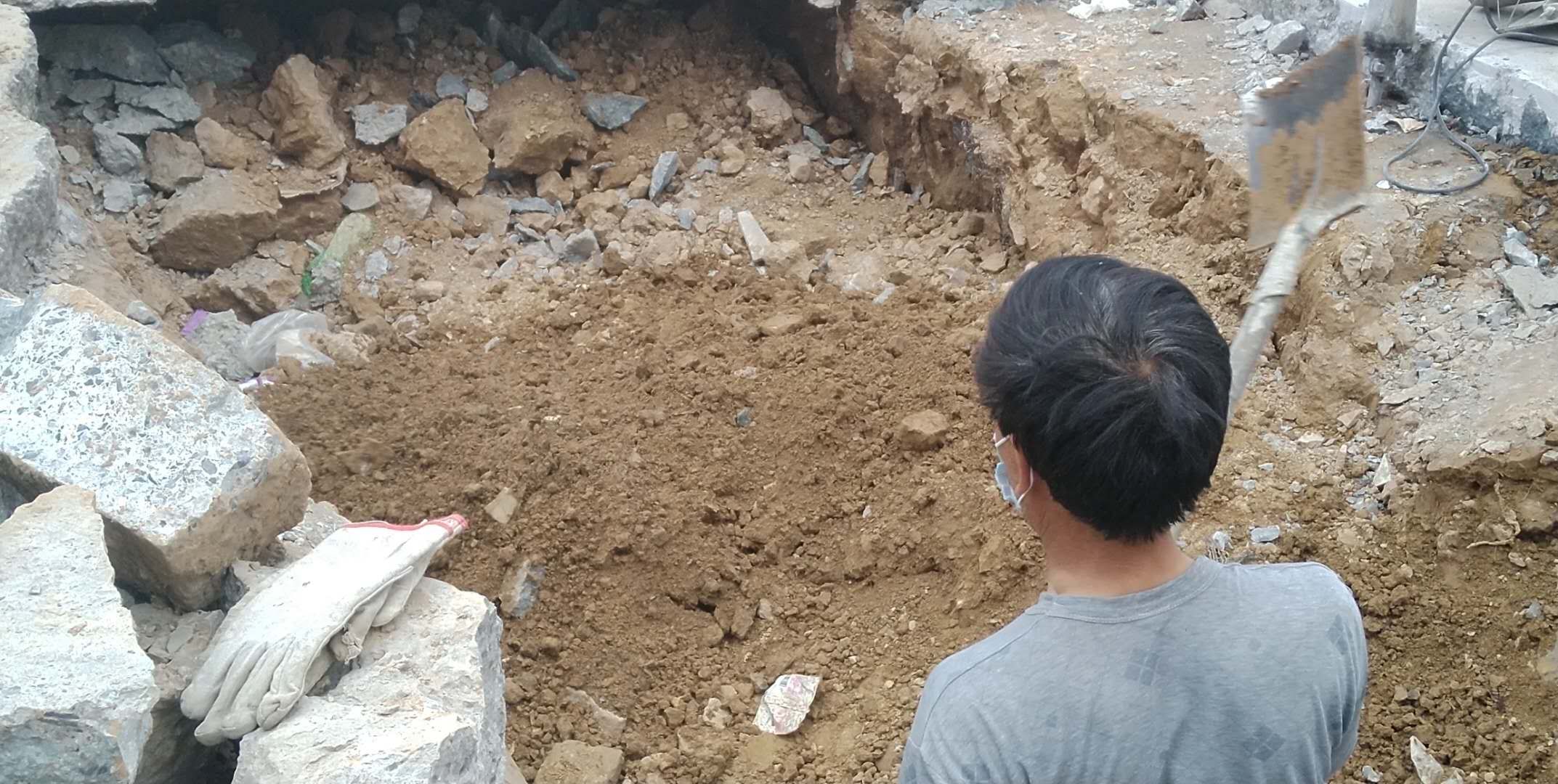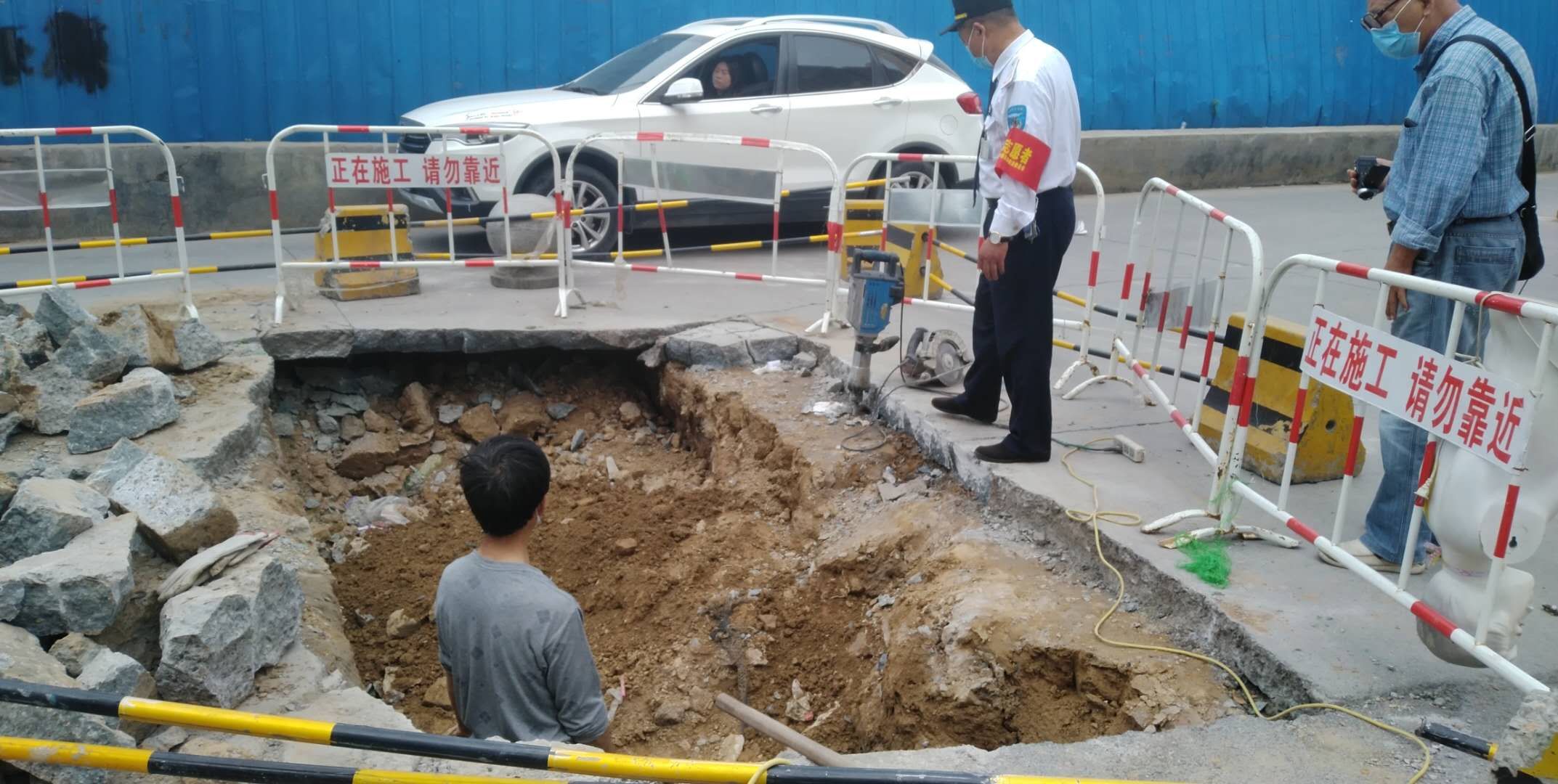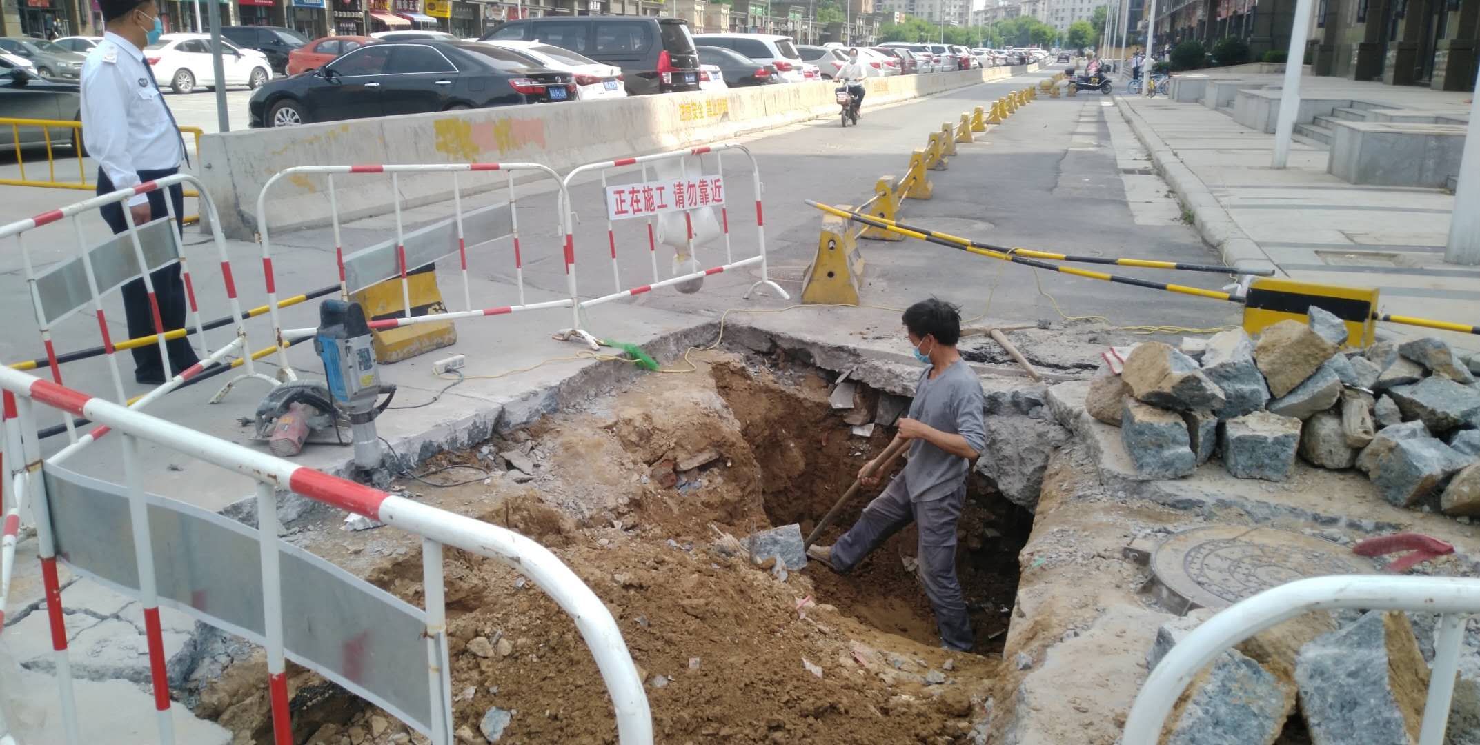 王师傅还说,目前,他们继续向下挖,到达底部后,重新填土,一层一层用三合土夯实。预计三天后就可使路面恢复正常通行,请附近居民放心。