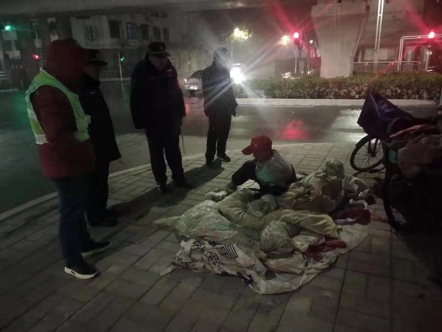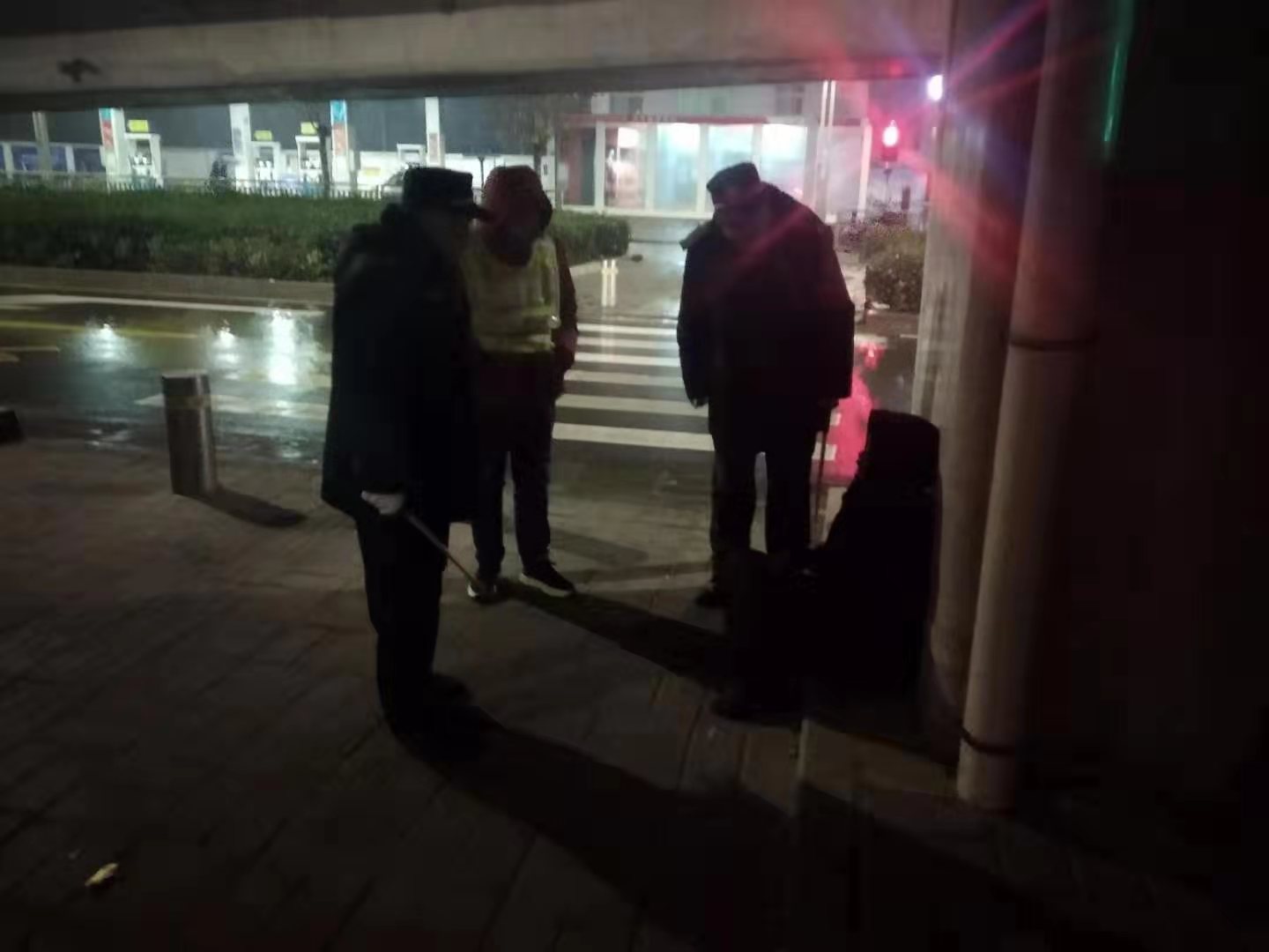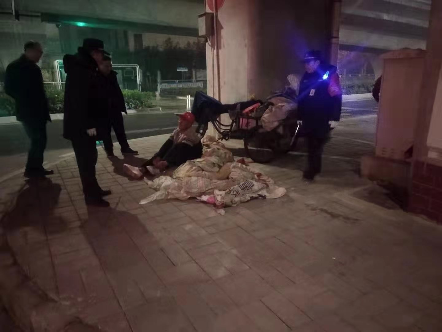 1月5日晚上21时40分,建中街巡防中队西福民分队队员张自强、李遂忠、范根喜巡逻到辖区陇海路交通路一立交桥下时,发现一名流浪乞讨人员,正蜷缩成一团,队员注意到,该男子躺在墙角处昏昏欲睡,流浪汉身上穿的衣服单薄,被冻的瑟瑟发抖。
