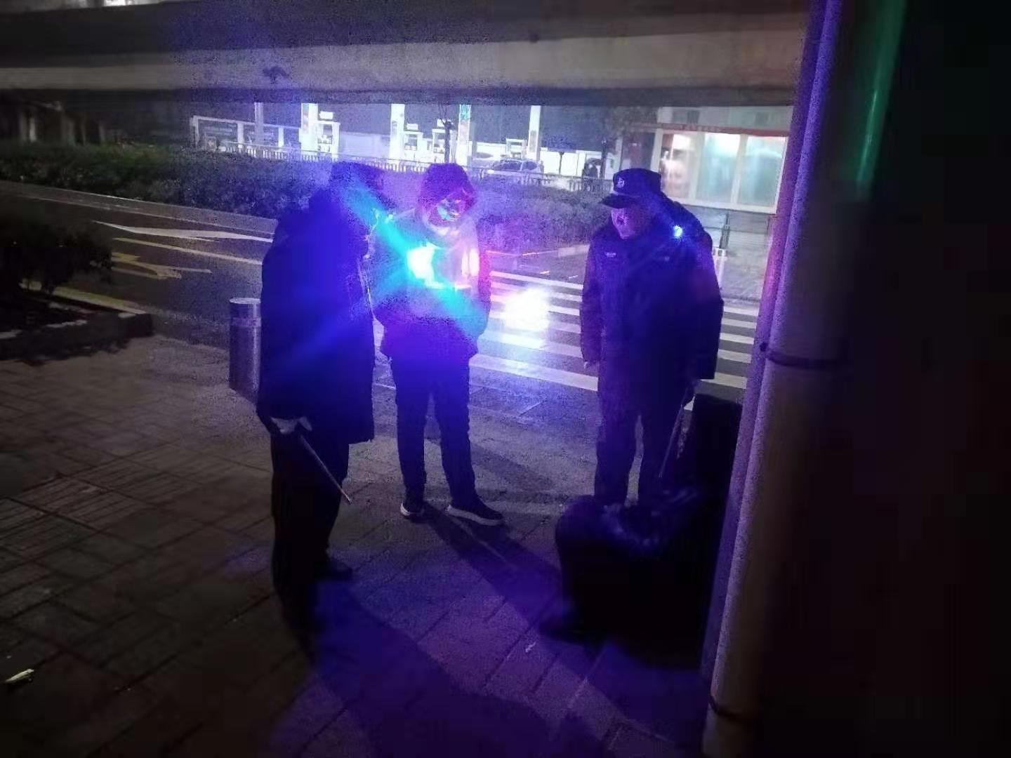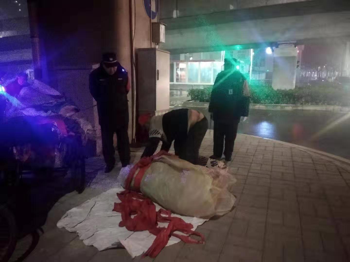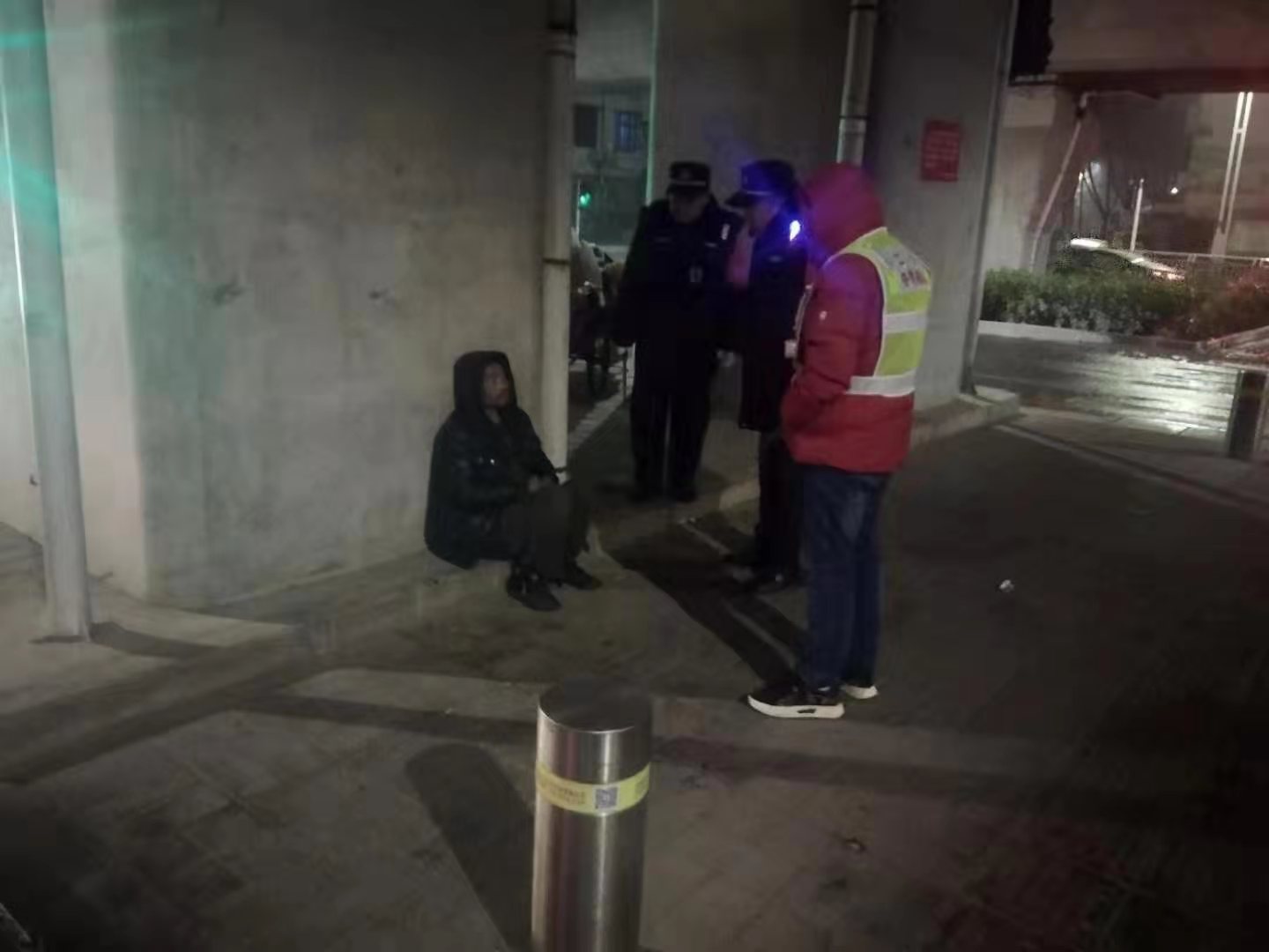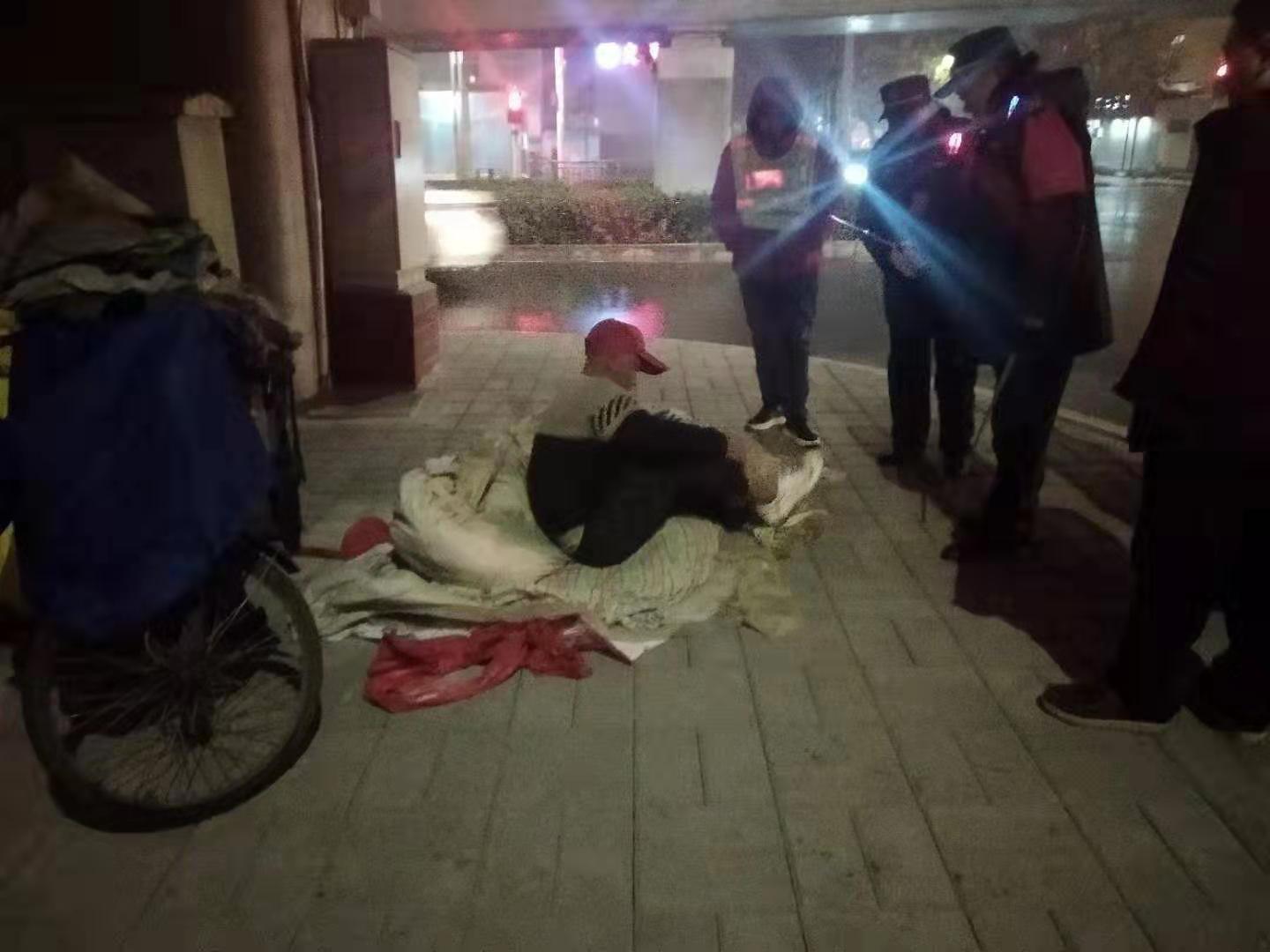 1月5日晚上21时40分,建中街巡防中队西福民分队队员张自强、李遂忠、范根喜巡逻到辖区陇海路交通路一立交桥下时,发现一名流浪乞讨人员,正蜷缩成一团,队员注意到,该男子躺在墙角处昏昏欲睡,流浪汉身上穿的衣服单薄,被冻的瑟瑟发抖。