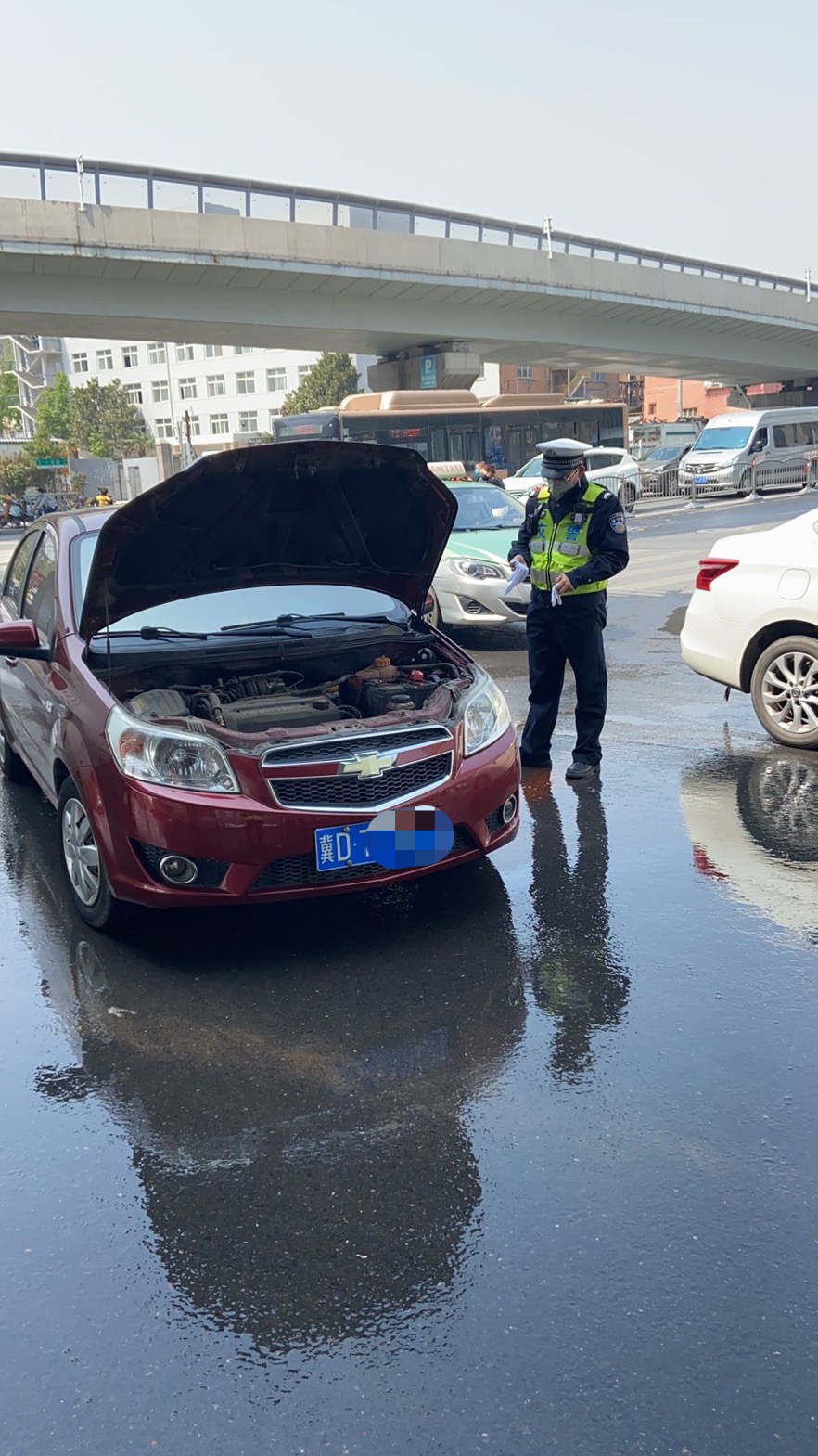 2020年4月6日中午12时27分,机动车驾驶员张XX驾驶红色雪佛兰轿车冀D 718CM 行驶至郑州一马路陇海向东辅道转弯时车辆引擎盖下面突然冒出大量白烟。