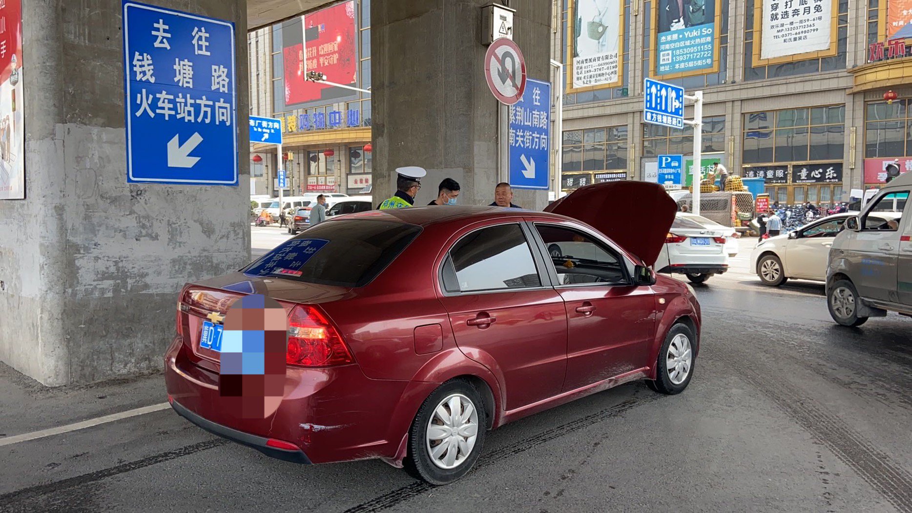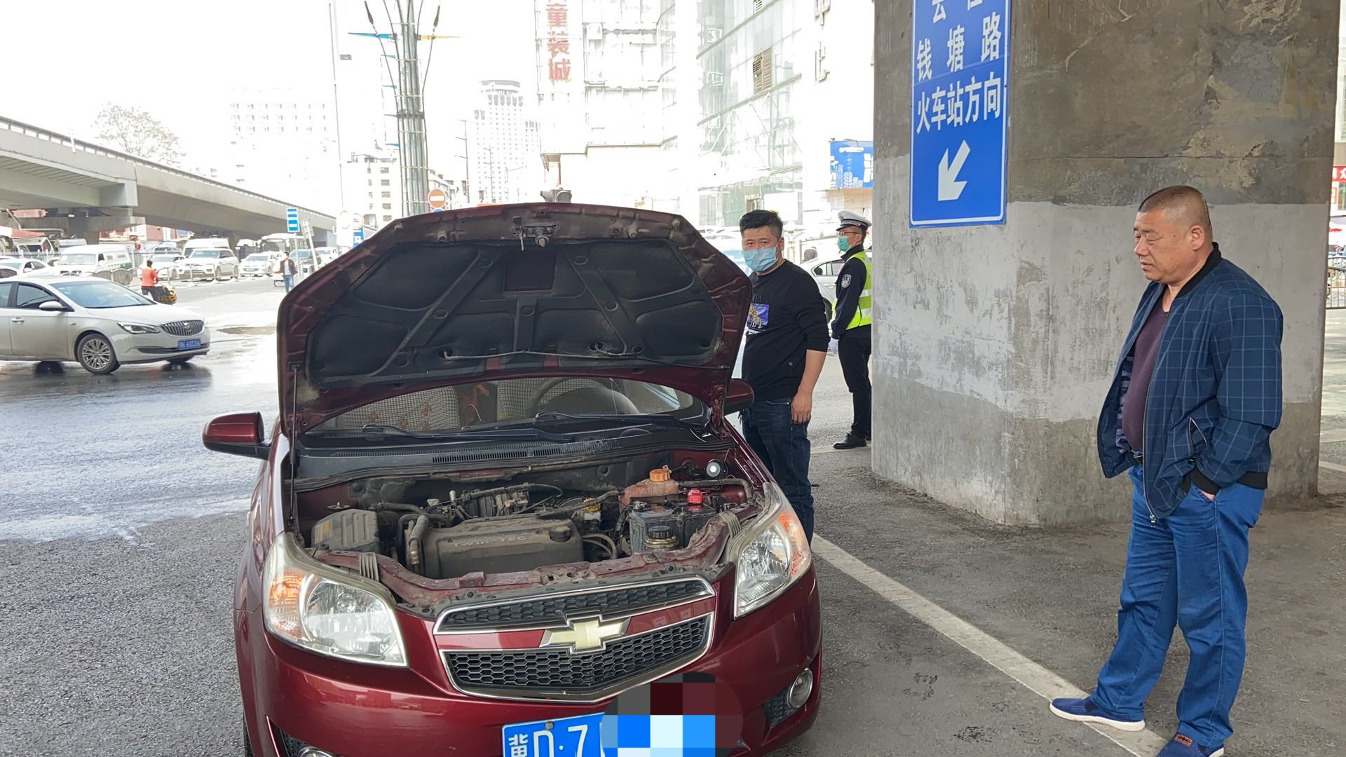 在路口执勤的郑州交警三大队车站一中队民警李明明、张东木,辅警李冠楠、边方圆第一时间发现异常,帮助司机离开驾驶室,及时打开引擎盖,车辆打开双闪,车辆后部放置三角警示架,引导后排车辆正常通行,防止造成路口交通拥堵。四位正岗交警,经初步检查是由于前一段时间车辆闲置在家,车辆今天突然使用,发动机故障引起水箱温度过高,导致水箱高温,冒出大量白烟,无法正常驾驶,最后民警联系救援车辆赶往现场修理。