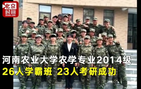 河南农业大学 农学专业26人的学霸班有23人考研成功。被英国约克大学、中国农业科学院等大学录取。大部分同学都觉得考研没有捷径,需脚踏实地。当问及考研秘诀时,班上的黄同学霸气回应:找个学霸女朋友。
