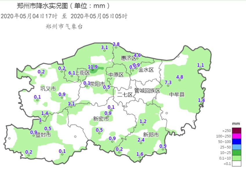 昨夜,郑州市局部地区出现阵雨天气。根据郑州市气象台监测,5月4日17时至5日5时,郑州市出现阵雨天气。各县(市)雨量较大的站点(毫米):荥阳的金寨11.9,中牟的白沙7.3,郑州的香山小学4.6,新郑的城关2.4,巩义的公川村1.4,新密的尖山伏羲山1.1,登封的少林水库1.0。