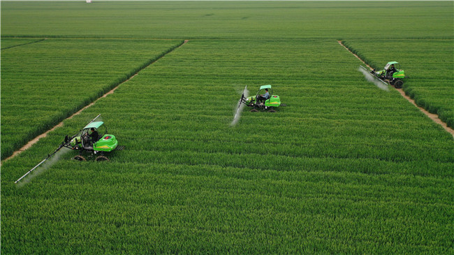在黄泛区农场,10万亩小麦长势良好,一辆辆绿色的自走式打药机在田间作业,张开16米长的“手臂”,药物呈雨雾状喷洒出来。农场副总农艺师缑国华说,农场10万亩小麦全部是种子小麦,订单种植,经过前期田间管理,一类苗达到了99%以上,夺取小麦丰收有基础。