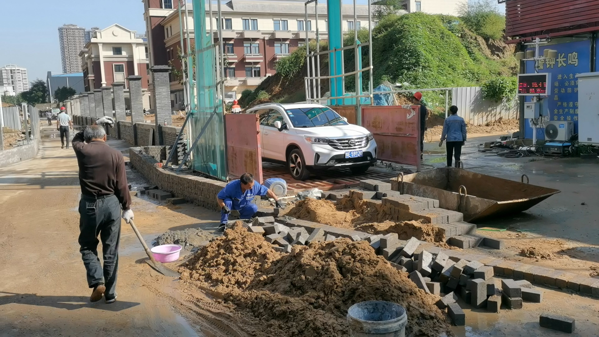9月29日上午,大河报记者前往果园路小学探访,只见通往学校的入口还被钢板围墙,进入后,多名工人正在混砂,校园内随处可见施工的工人。