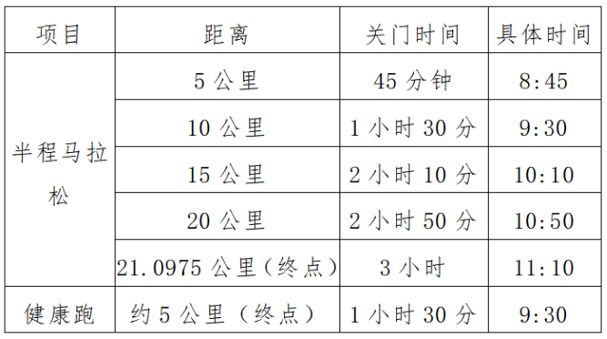关门位置和时间:为了保证参赛选手比赛安全,限时对社会交通进行管制。比赛路线各段专设了赛时关门时间,关门时间之后,相应公里点的计时毯停止工作,相应路段将恢复社会交通。在规定关门时间内,未跑完对应距离的参赛选手必须立即停止并退出赛道,以免发生危险。退出比赛的选手可搭乘收容车到达终点取衣区。关门时间按自然时间计算,具体见下表: