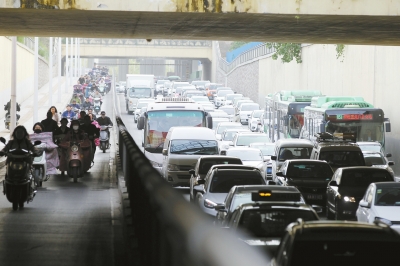 9时30分左右,河南商报记者在北三环南阳路下桥匝道口附近注意到,每当红灯时,下桥的车辆便排起长龙。该匝道口附近疏导交通的一名工作人员介绍说,“上午这个路段一直堵,南阳路方向的车辆一直快不起来。”