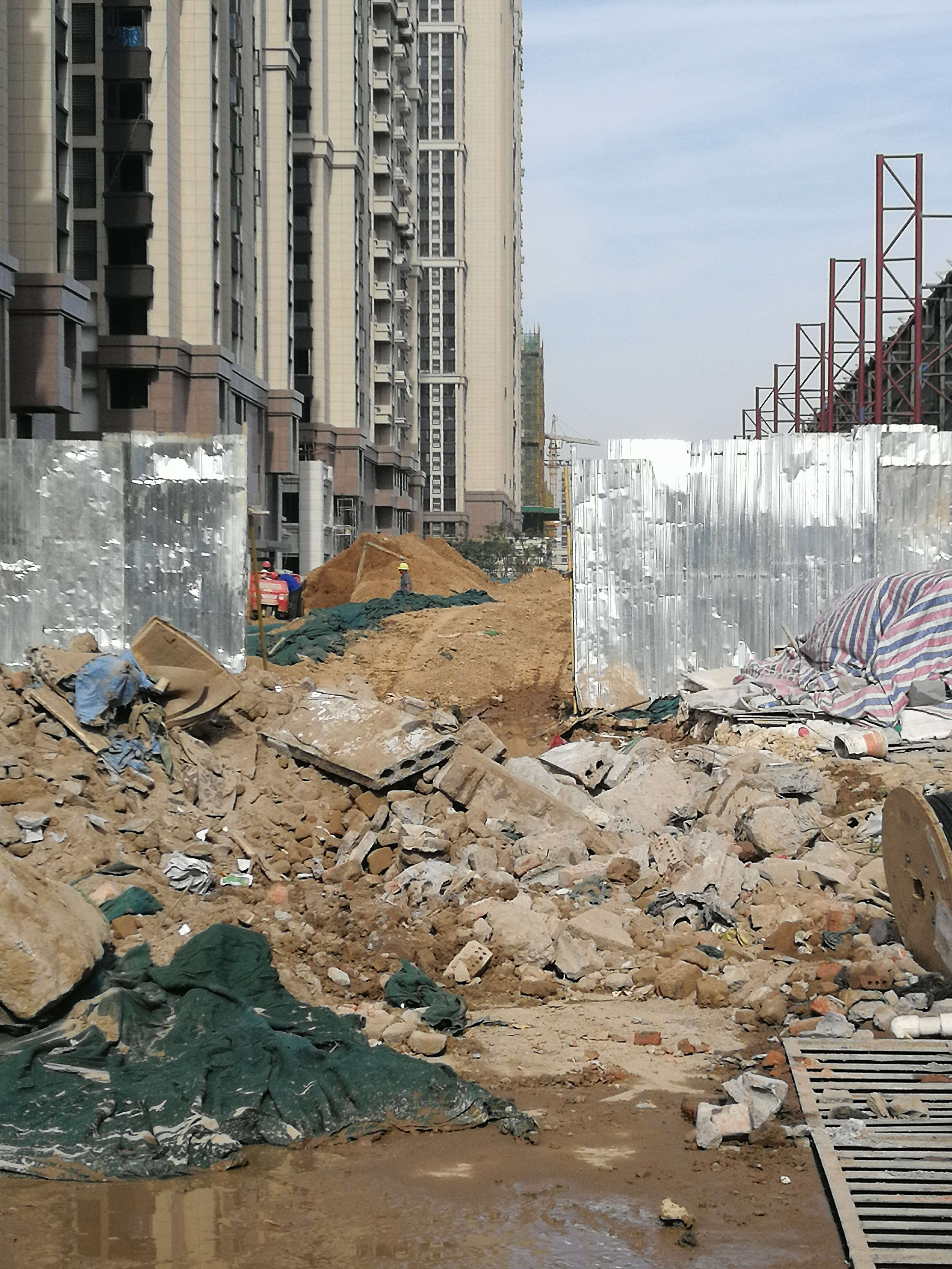 在该工地的北门处,记者看到工地内正在进行土方作业,靠近北侧围挡的地方,有大面积的黄土裸露,尘土飞扬,地面上堆积着许多建筑垃圾,显得脏乱不堪。据工地的施工负责人毛经理介绍,该工地目前正在进行绿化施工,可能是因急着赶工期,工人们没有及时对挖出的渣土进行覆盖。