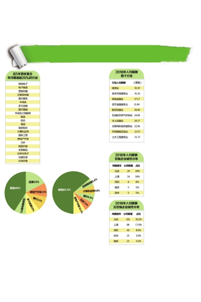 其他电子(主要包括信息技术、材料、工业、可选消费等行业)、电子制造、营销传播、互联网传媒、医疗服务五大行业在近5年保持了30%以上的营收复合增长率;半导体、多元金融、医疗机械、环保及工程服务、物流、综合、酒店、旅游综合、计算机运用、园林工程、房地产开发等行业,也实现了20%以上的营收复合增长率。