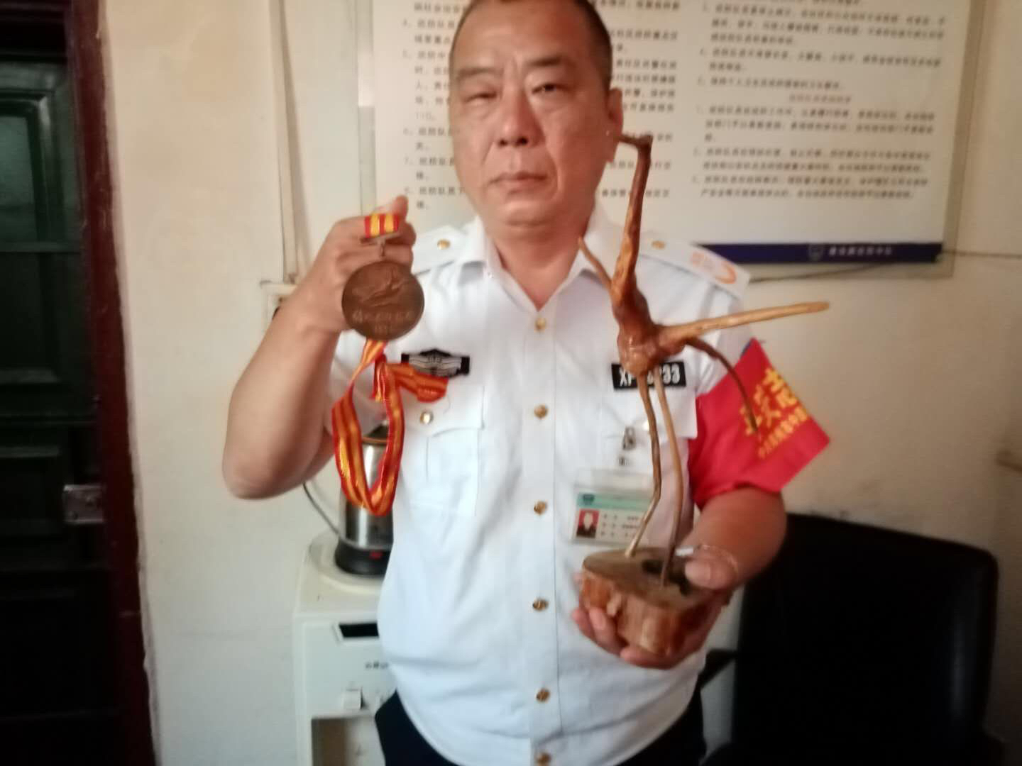 今天上午8时许,中原区建设路街道巡防队员李勇、徐金岭,巡逻到前进路287路公交车站牌时,看到站牌后的一堆施工管道边,放着一个红色的袋子。起初,队员以为是有人随手丢弃的垃圾,可打开一看,竟然在袋子里找出一个根雕作品和一枚奖牌。