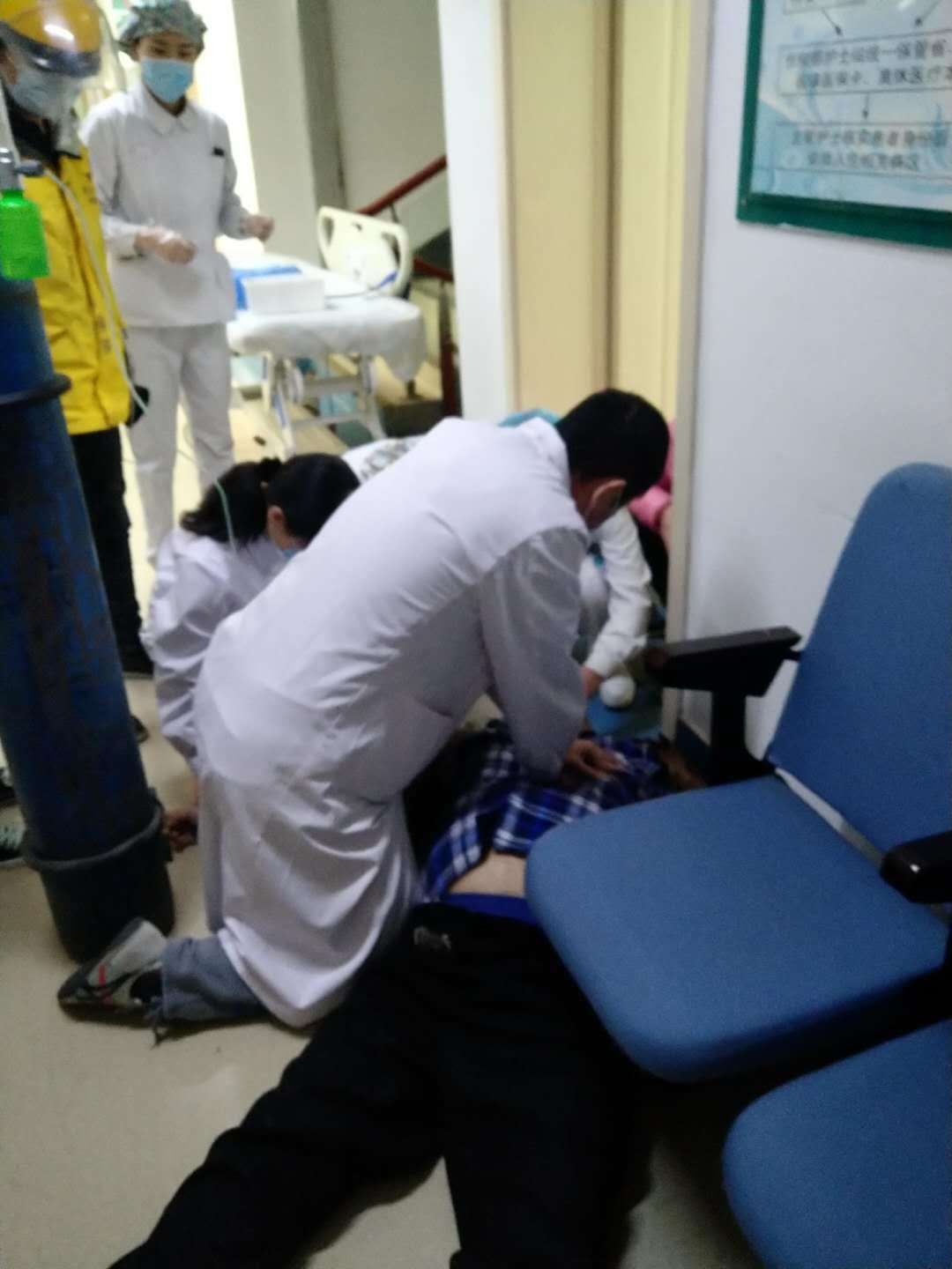 医护人员合力,将男子调整为仰卧位。妇科副主任医师周艳梅立即对男子实施胸外心脏按压急救。与此同时,耳鼻喉科副主任医师赵娟、眼科副主任医师张小玉分别紧急通知急诊科和医务科。