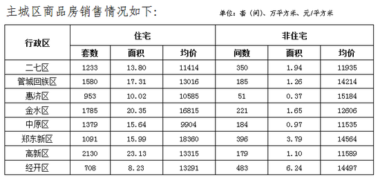 郑州全市商品房销售24232套(间),销售面积269.12万平方米,销售均价11110元/平方米;其中商品住宅销售20294套,销售面积236.5万平方米,销售均价11144元/平方米。非住宅销售3938套(间),非住宅销售面积32.62万平方米,非住宅销售均价为10865元/平方米。