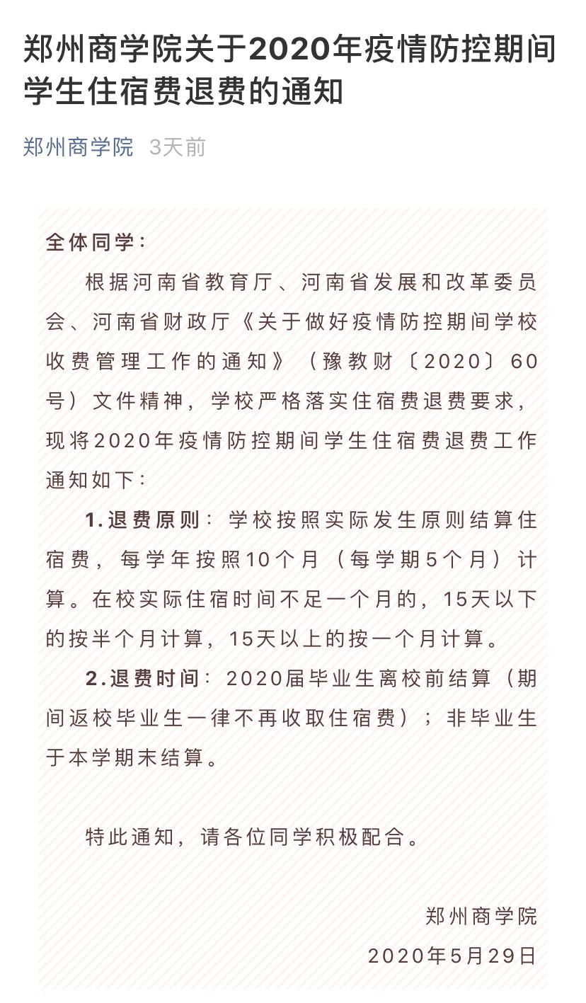 根据河南省教育厅、河南省发展改革委员会、河南省财政厅《关于做好疫情防控期间学校收费管理工作的通知》(豫教财〔2020〕60号)精神,结合我校实际情况,经研究决定退还疫情防控期间住宿费。退费范围:2019-2020学年全体在校生。退费原则:学校按照实际发生原则收取住宿费,每学年按照10个月(每学期5个月)计算,由于疫情无法返校,因此学校退还2019-2020学年一个学期(5个月)住宿费。2020届毕业生按学校有关通知要求返校办理毕业手续期间免收住宿费。退费时间:自本通知发布之日起五个工作日内退款到位。