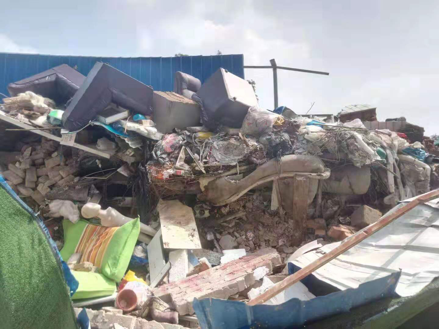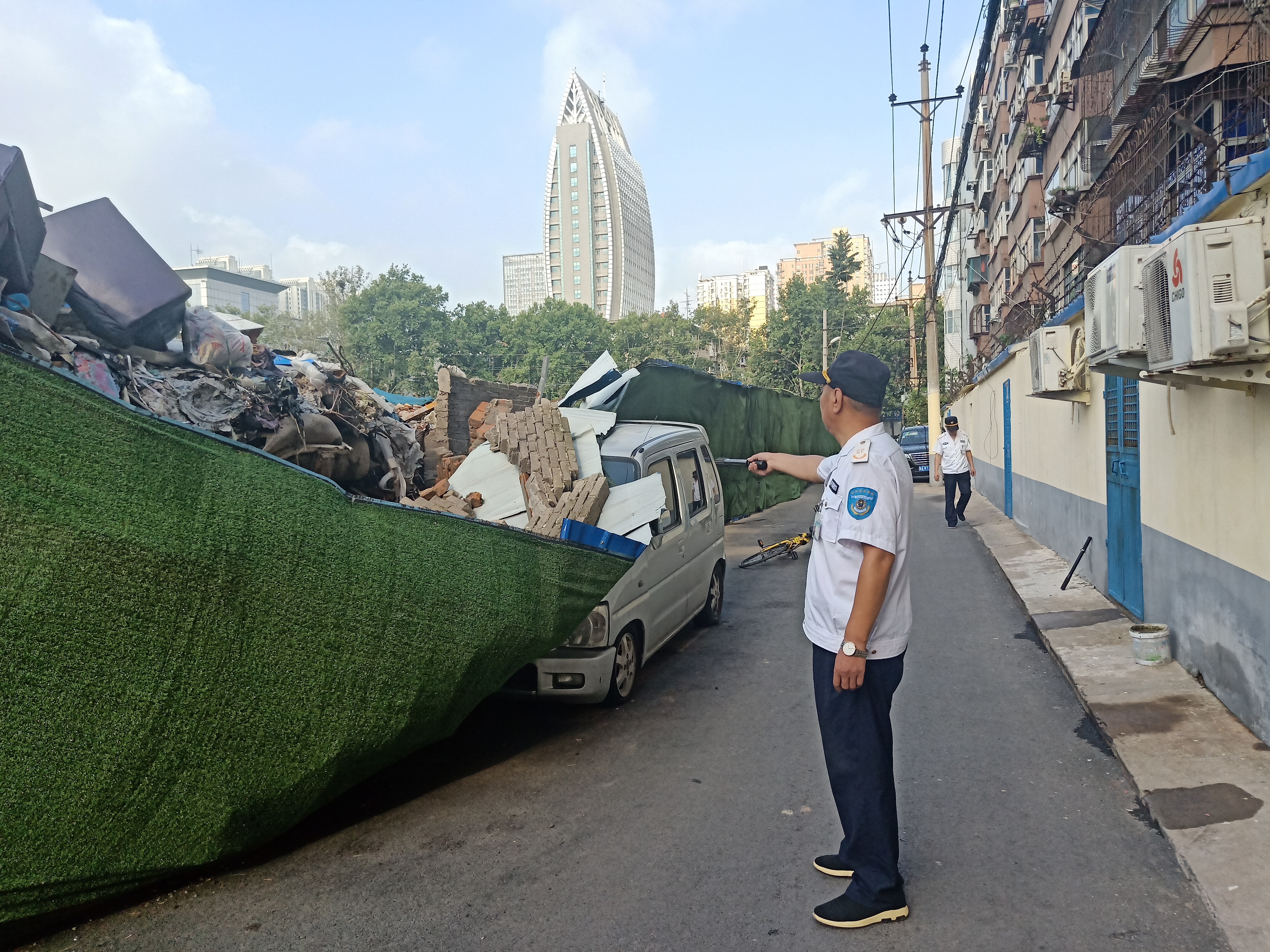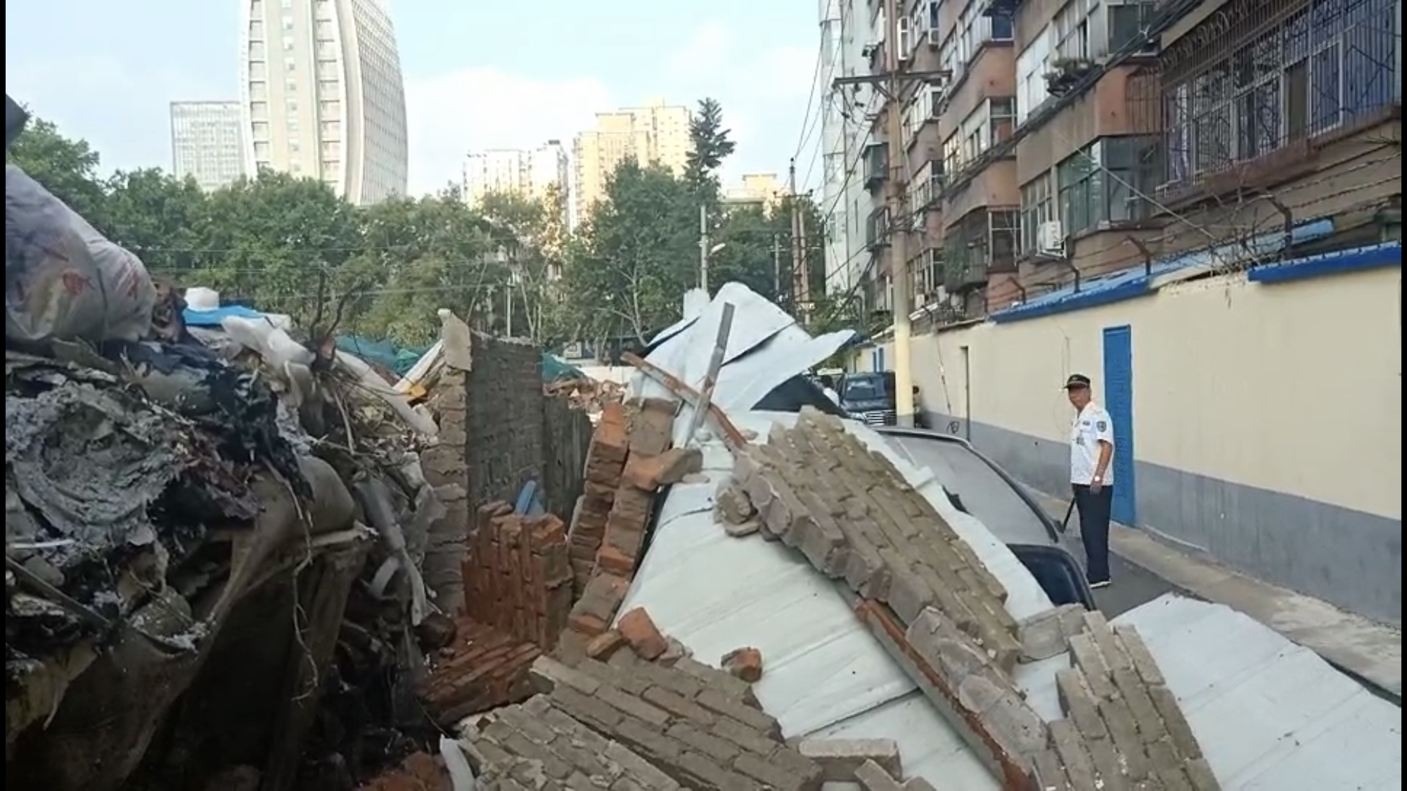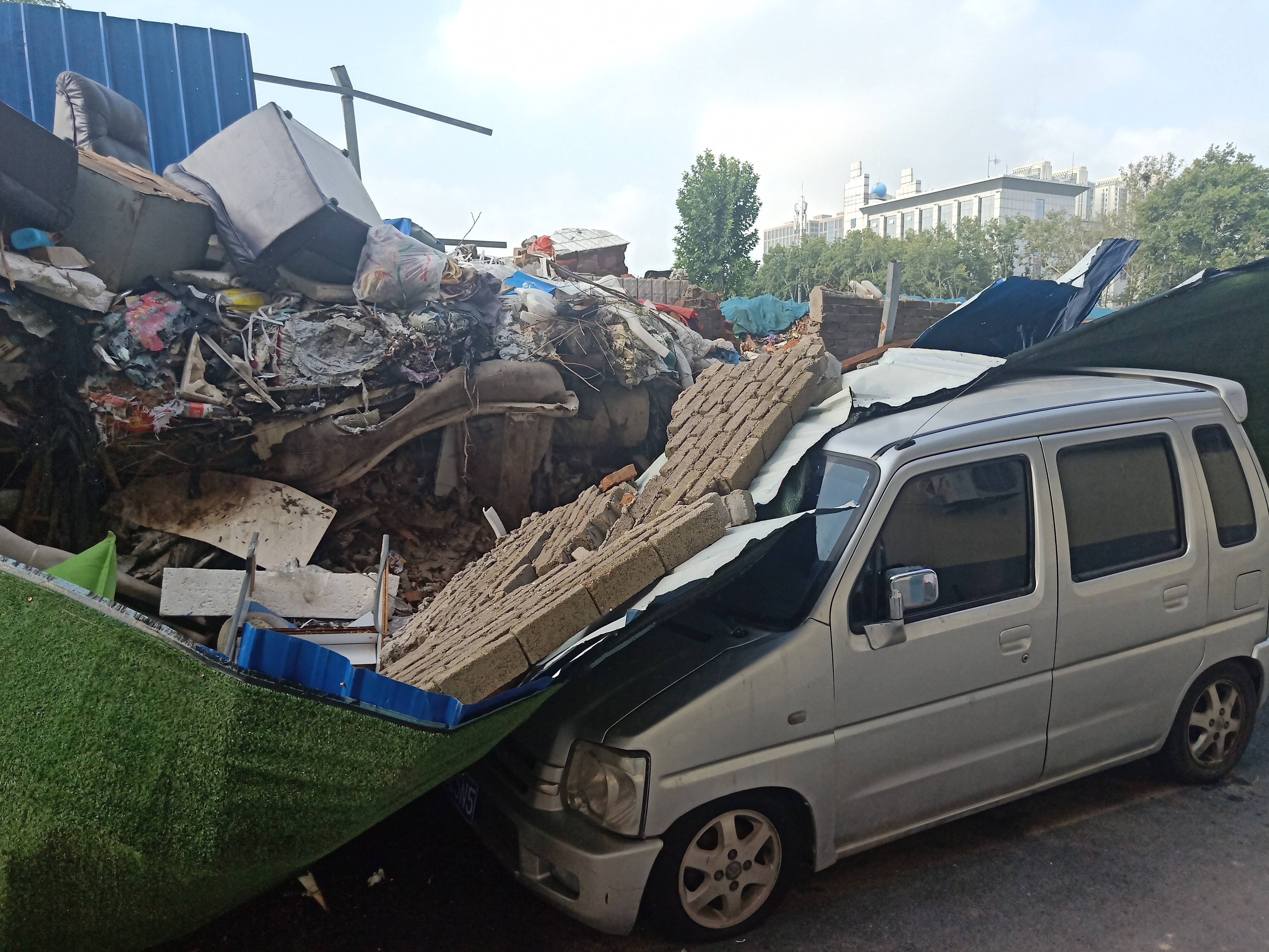 8月8日早上7时,中原区建设路办事处巡防队员李勇和徐金岭,途经中原路与伏牛路交叉口北约100米路东的一条小胡同时,看到一辆停在胡同内的面包车,被砸在坍塌的工地围墙下面。这扇用砖砌的施工围墙外面,包裹着一层蓝色的铁皮,是被工地里倾倒的建筑垃圾压塌后,砖块和铁皮一起砸在面包车上,导致面包车前引擎盖被压出大坑。