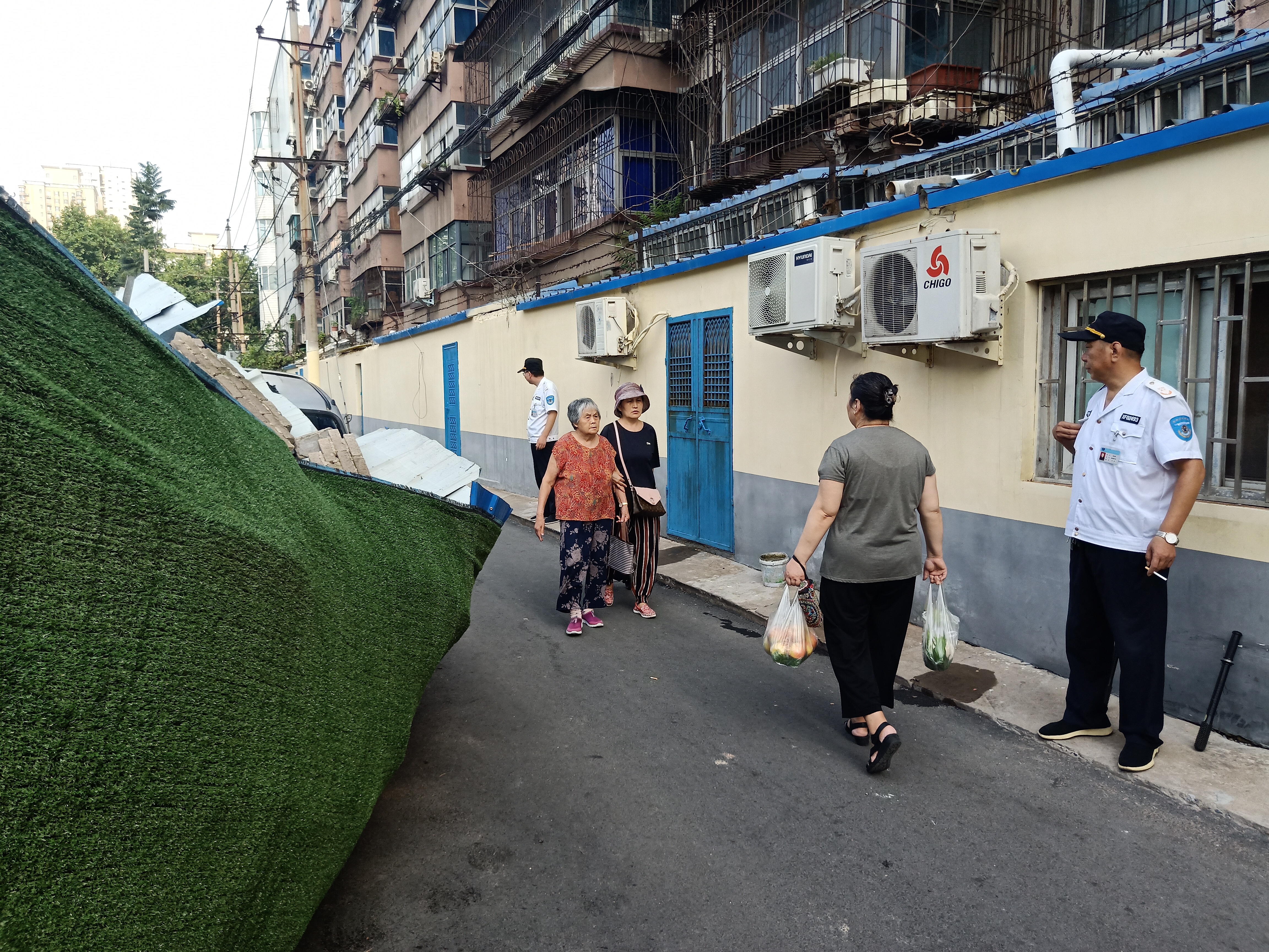 据了解,围墙坍塌的胡同,是前进路50号院居民出入的通道,为避免施工围挡再次发生倒塌后伤及行人,李勇和徐金岭忙在现场疏导交通,提醒行人和车辆不要在围挡下面经过。绿东西办事处的工作人员赶到现场后,立即在现场贴出“禁止停车”的告示。