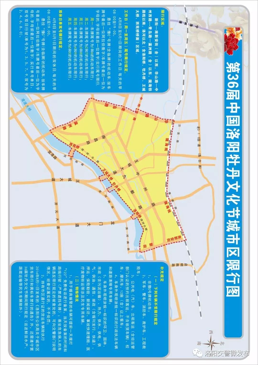 为提高第36届中国洛阳牡丹文化节期间城区道路通行效率,提升道路通行能力,缓解交通拥堵,给中外游客提供畅通有序的交通环境,按照市委、市政府“以节促建、以节促管、以节推介、利民惠民、全面提升”的要求,本着喜迎八方游客、外地车辆优先的原则,依据《中华人民共和国道路交通安全法》《河南省道路交通安全条例》等有关规定,第36届中国洛阳牡丹文化节期间,在城市区部分区域实行机动车绕行、错峰出行限行措施,现通告如下: