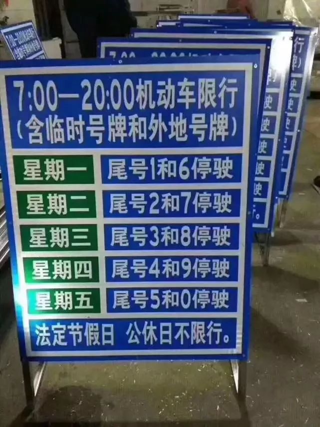 工作日每天限行两个号 。即:周一:1和6限行,周二:2和7限行,周三:3和8限行,周四:4和9限行,周五:5和0限行。(因法定节假日放假调休而调整为上班的周六、周日,按对应调休的工作日限行)