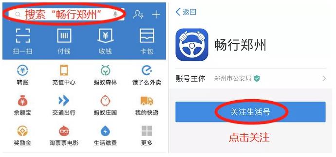 打开支付宝,在搜索框输入“畅行郑州”,关注郑州交警支付宝生活号。