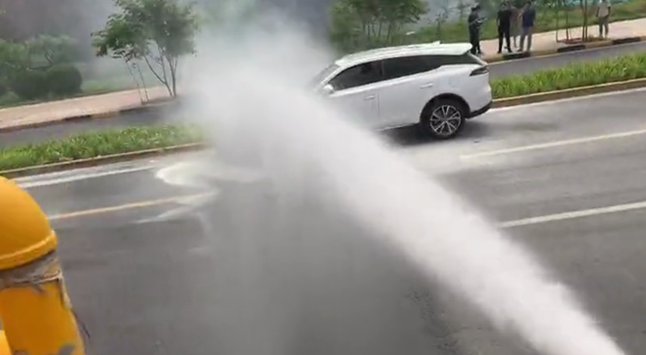 6月23日上午11时许,郑州花园路与英才街交叉口向南100米处,一辆白色新能源汽车正在行驶中突然自燃,这时,正在附近供水管网抢修的洒水车立即赶了上去,用水将洒水降温,最终将火浇灭。