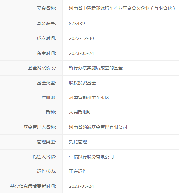 【大河财立方消息】5月25日消息,记者从中基协了解到,河南省中豫新能源汽车产业基金合伙企业(有限合伙)已于5月24日完成备案。