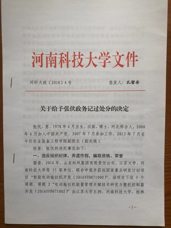 “上个学期末(注:2018学年下学期),张伏被人举报,学校调查落实后,给各个单位都下发了给予张伏纪律处分的红头文件。”接受采访时,反映人向记者提供了一份落款为“河南科技大学”的河科大政{2018}4号红头文件。文件签发日期为2018年12月12日。签发人为孔留安,记者查询发现,孔留安系河南科技大学党委副书记、校长。