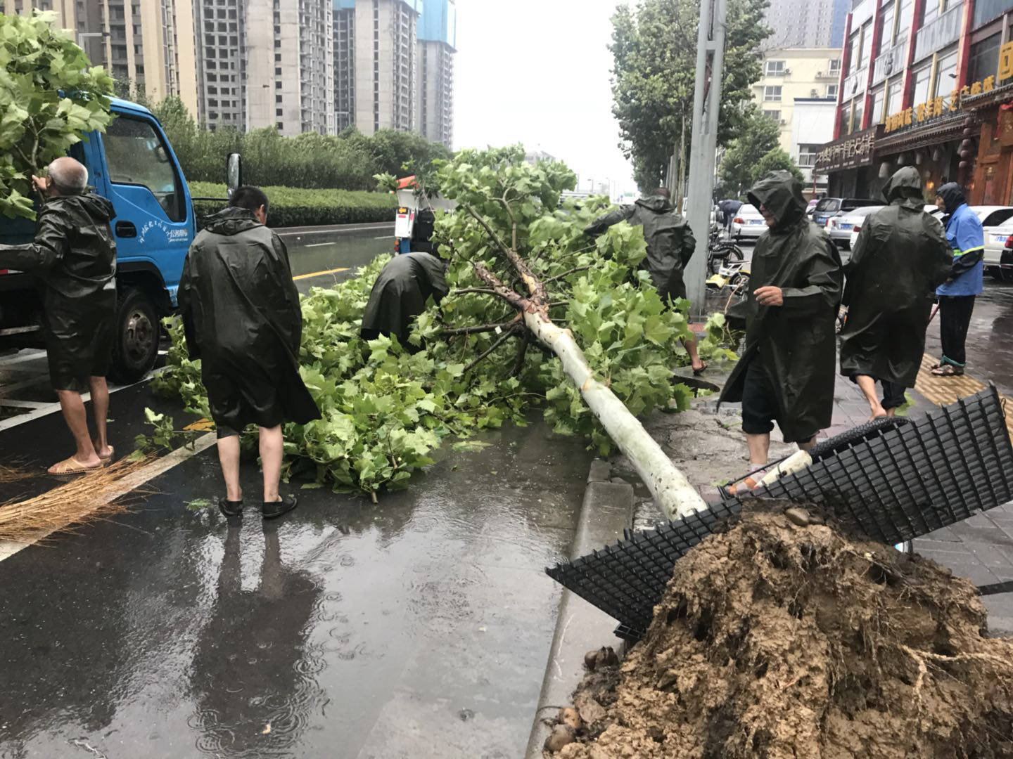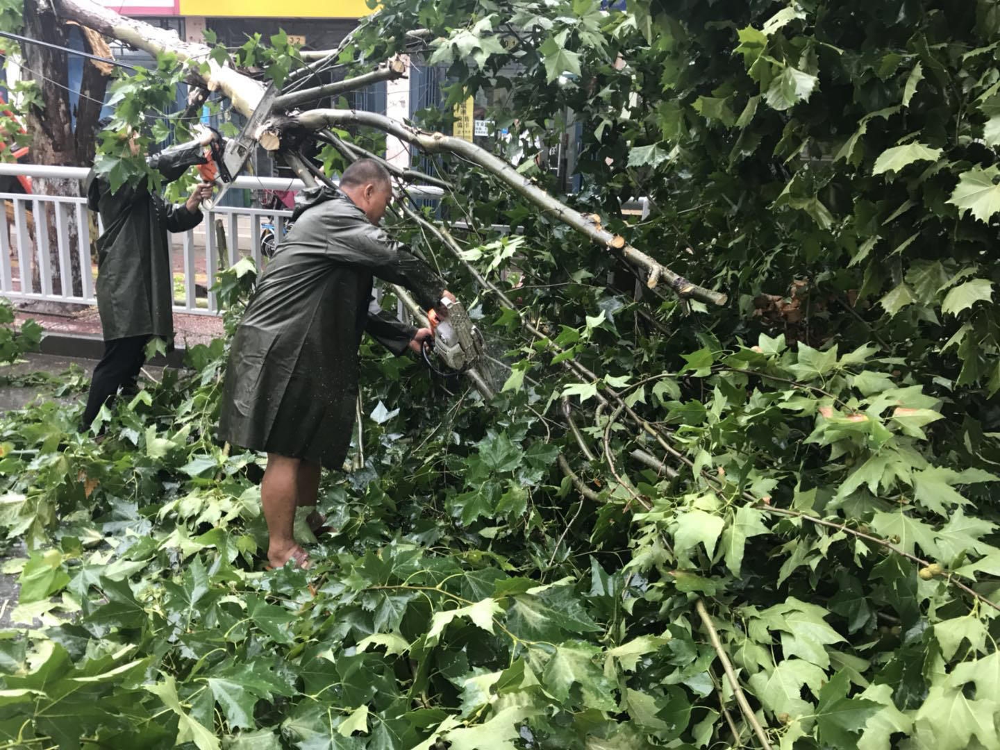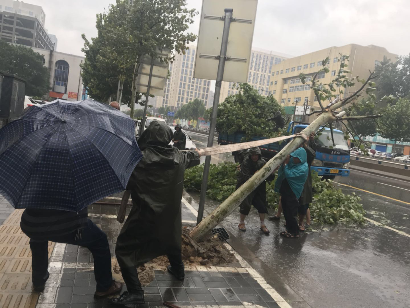 周末的一场急雨,让郑州街头的行道树很受伤,频频发生大树被刮倒、树干被拦腰折断、树枝被掉的情况。为了避免落地的大树和枝叶影交通和伤人,郑州城市道路绿化管理处的抢险人员放弃周末休息时间,冒雨奋战在抢险一线。